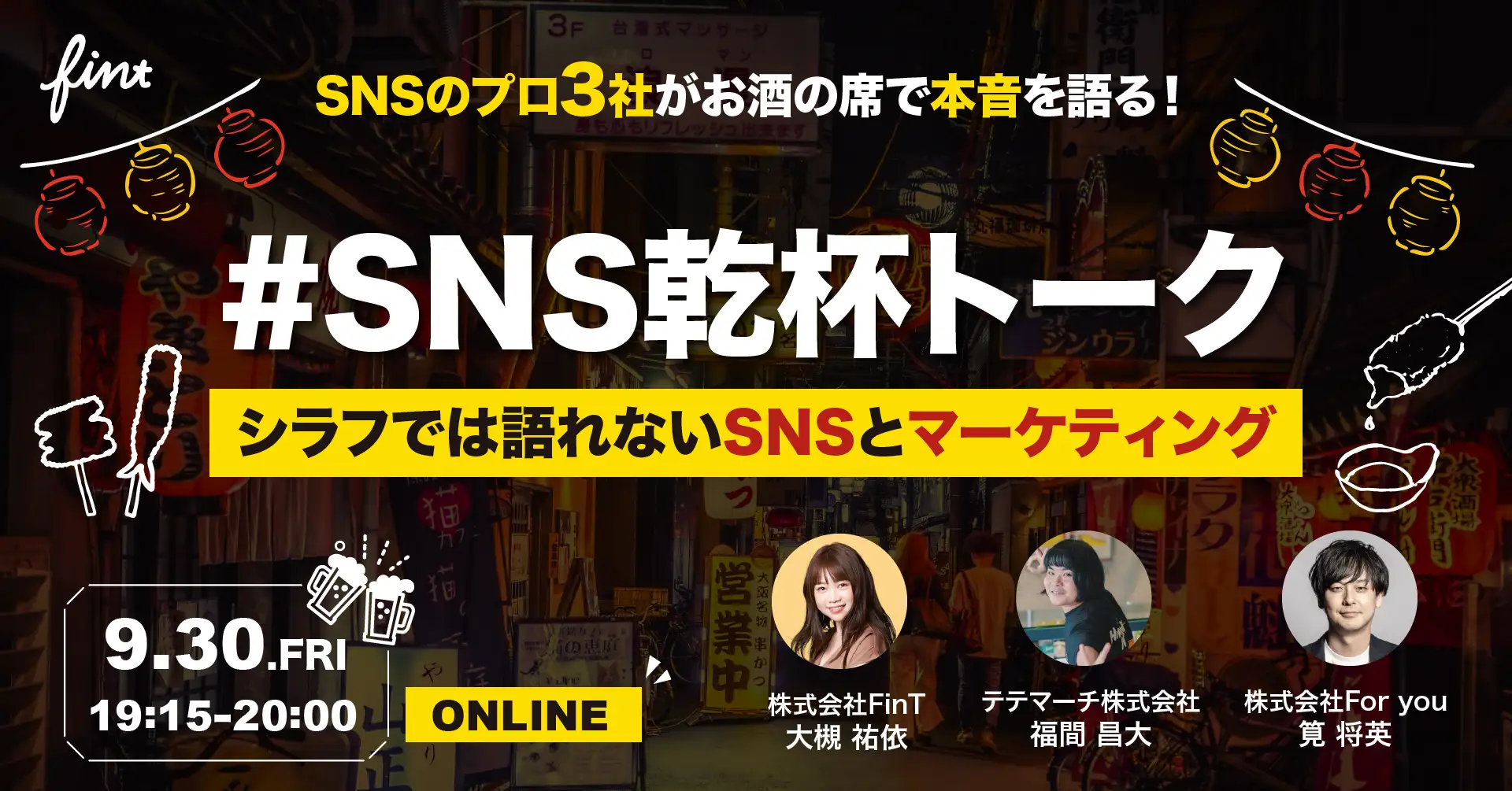 そこで今回は、株式会社FinT・テテマーチ株式会社とのウェビナー「SNSのプロ3社がお酒の席で本音を語る!『#SNS乾杯トーク』シラフでは語れないSNSとマーケティング」共催が決定いたしました。「SNSとマーケティング」をテーマに、お酒片手に3社でトークセッションを行って参ります。ご視聴者の皆様もぜひお酒を飲みながら、ご気軽にご参加いただけますと幸いです。
