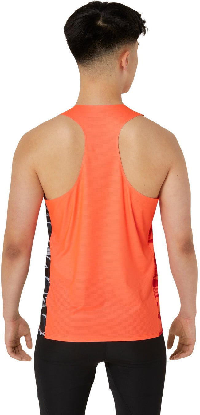 軽量性を追求したシングレットです。ペットボトル由来のリサイクルポリエステルを100%使用した軽量素材を採用し、アシックスの陸上競技用ウェア史上最軽量(2024年7月1日時点)の重量約46グラム(Lサイズ)を実現しました。東京2020オリンピック競技大会着用モデルと比べて約25%軽くなっています。前身ごろにはっ水加工を行うことで生地への汗吸収を抑えるなど、競技中にウェアが重くなりにくく、肌離れしやすい仕様になっています。また、アシックススポーツ工学研究所の動作シミュレーションに基づいた深い袖ぐり設計により、肩甲骨や肩まわりの不快感を軽減しています。