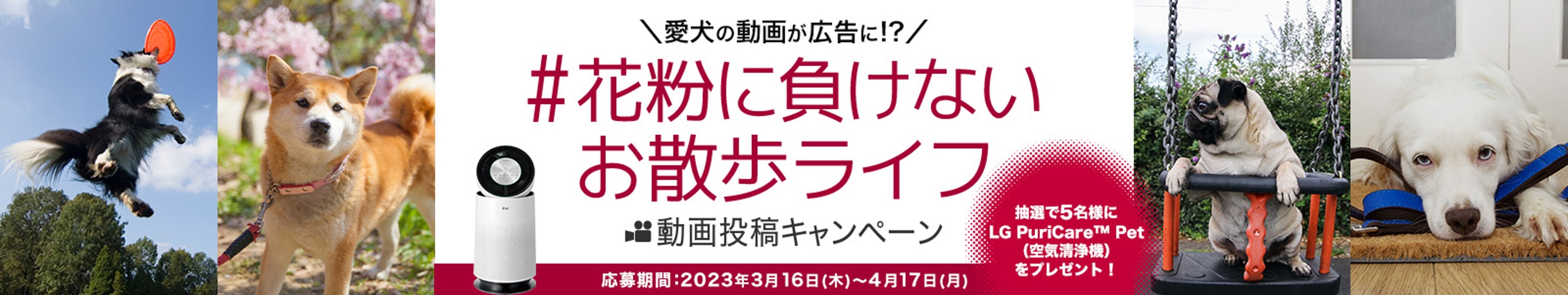 「LG PuriCare™ Pet」は、空気中の花粉を低減することが試験によって証明されています。本キャンペーンでは、花粉に負けず愛犬と元気にお散歩をしてほしいという思いを込め、“愛犬と一緒にお散歩を楽しんでいる「動画」”を撮影し、ハッシュタグ「#花粉に負けないお散歩ライフ」をつけて、ご自身のTwitterに投稿いただくと、抽選で5名様に「LG PuriCare™ Pet」をプレゼントします。