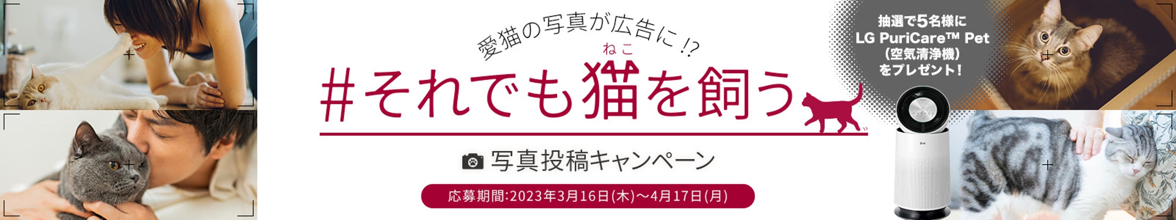 「LG PuriCare™ Pet」は、ペット由来のアレル物質も低減することが試験によって証明されています。本キャンペーンでは、ペット由来のアレル物質にお困りの方にも、愛猫との至福な時間を過ごしてほしいという思いを込め、実施します。 “愛猫と寄り添う至福タイムの「写真」”または“愛猫のかわいい「写真」”を撮影し、ハッシュタグ「#それでも猫を飼う」をつけて、ご自身のTwitterに投稿いただくと、抽選で5名様に「LG PuriCare™ Pet」をプレゼントします。
