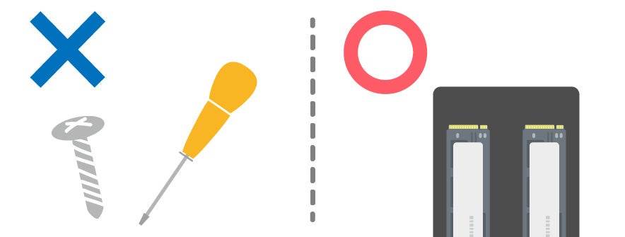 本製品へのSSDの装着にドライバーなどの工具は不要です。準備に手間取ることなく、誰でも簡単にSSDを装着することが可能です。