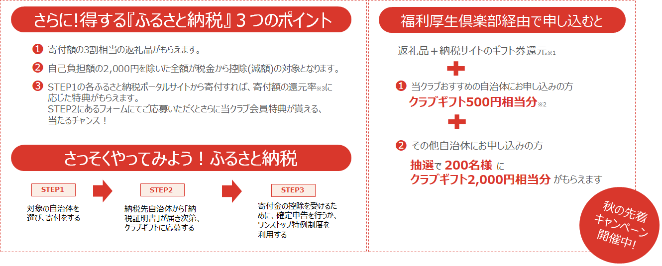 *2 「クラブギフト」は福利厚生倶楽部のポイントプログラムです。1万円以上の寄付が対象となります。さとふるは600円相当分になります