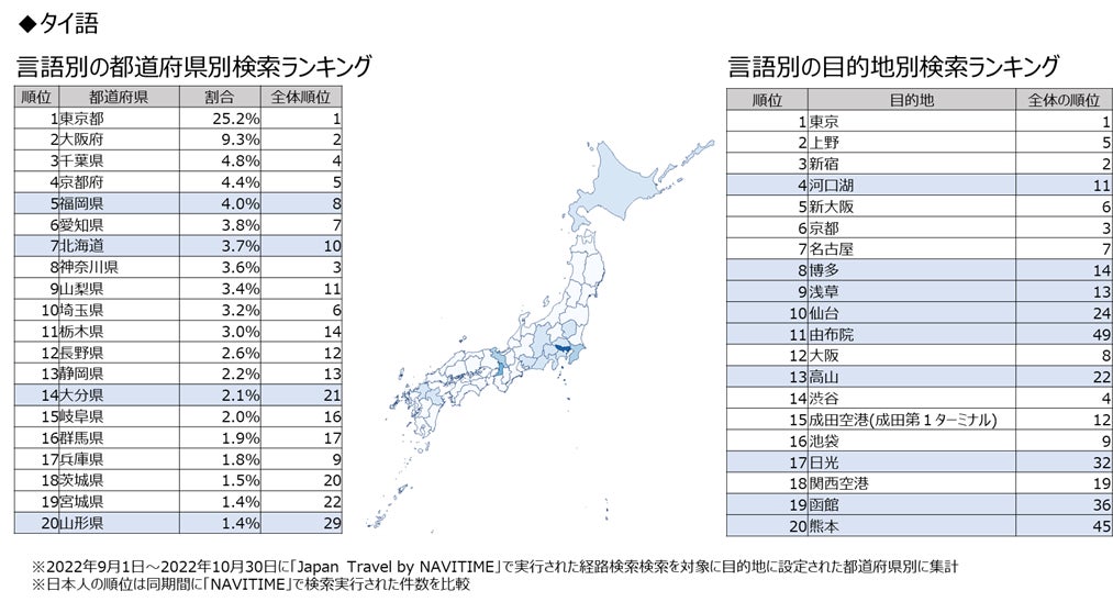 タイ語利用者では、福岡、北海道、大分、山形の順位が高い傾向にあり、東京の占める割合が25.2%と、全体の検索割合の31.8%よりも低く、特定の地域への偏りが少なく、関東、中部、関西エリアを中心に全国を広く検索していることがわかります。また、スポットでは由布院、熊本の順位が高いのが特徴的です。