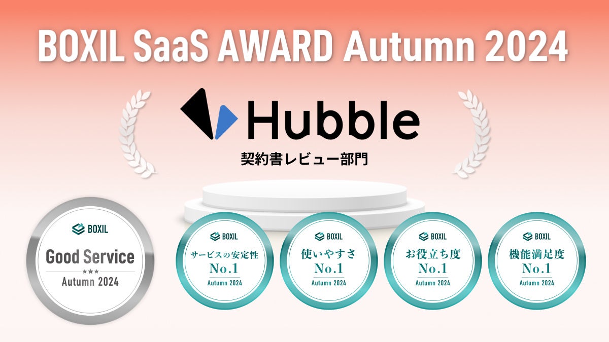 契約業務・管理クラウドサービス「Hubble」、「BOXIL SaaS AWARD Autumn 2024」契約書レビュー部門において「Good Service」他4つのNo.1を2期連続受賞