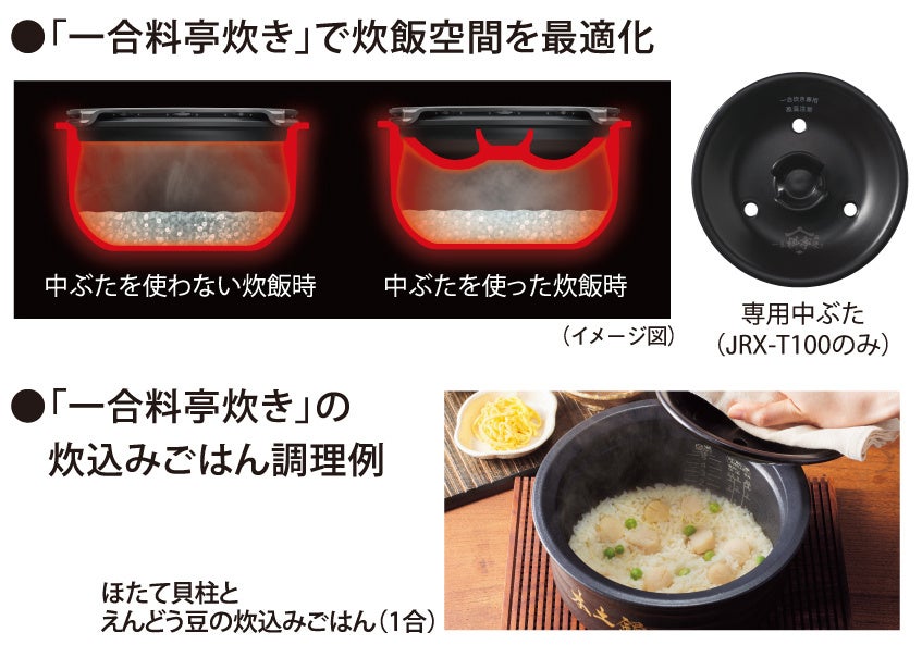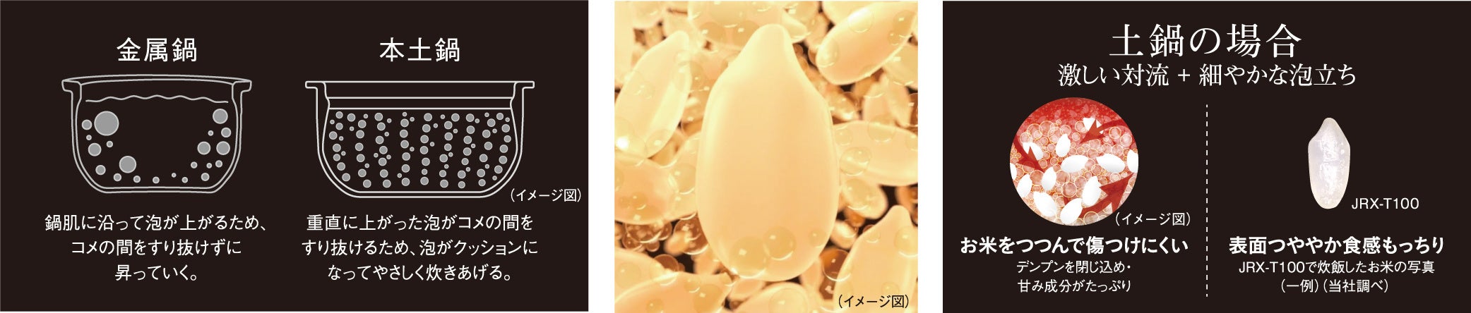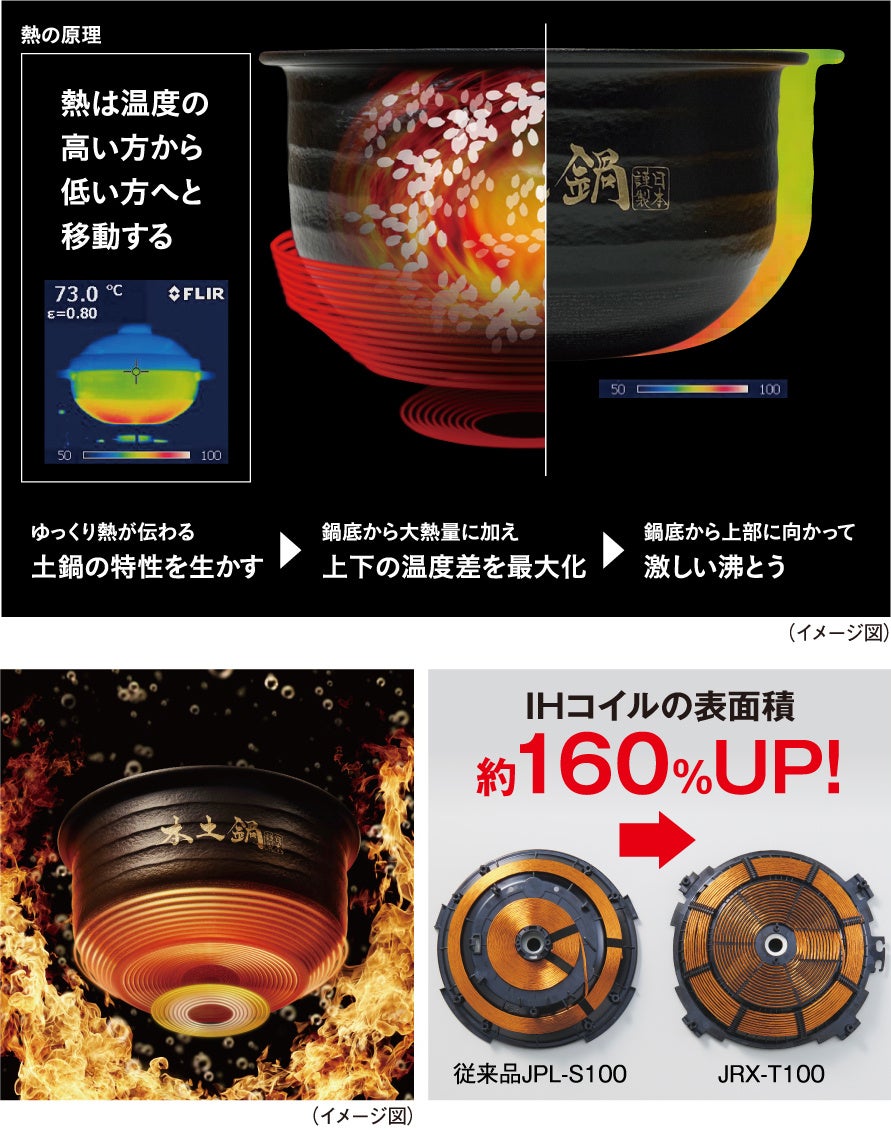 ※1 JRX-T100において「白米」メニュー4合、炊きわけ「しゃっきり」、火かげん「強」炊飯時。内なべ外側底面の温度(当社調べ)。JRX-T060は約250℃ ※2 2023年12月14日現在(当社調べ)※3 ワークコイルで覆われた部分の面積において、JRX-T100と当社従来品JPL-S100(2022年製)との比較。JRX-T100 26207mm2 JPL-S100 16695mm2(当社調べ)※4 JPX-T100と当社従来品JKT-P100(2021年製)の内なべの比較。なべ底内側の温度 本土鍋230度、金属鍋110度(実際の炊飯時の温度を想定) の場合のピーク時の遠赤放射エネルギー量の比較。JRX-T100 397.6Wm-2 μm-1 JKT-P100(2021年製)97.7Wm-2 μm-1(当社調べ)