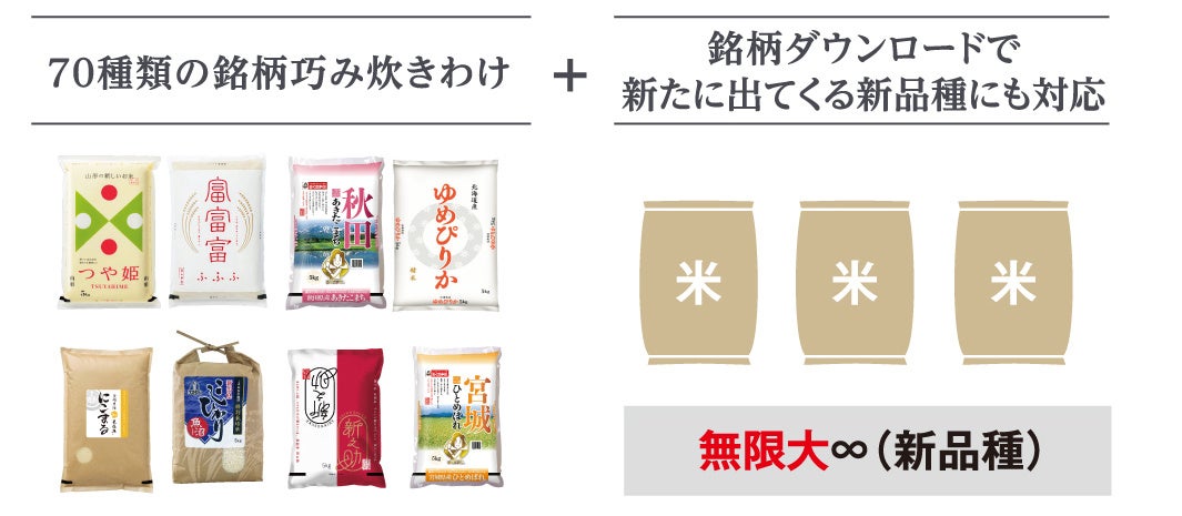 日本には約900種類※もの米が存在し、毎年多くの新ブランドが誕生しています。アプリと連携することで、新たに発売されたブランド米に対応した炊飯プログラムをダウンロードすることが可能です。お米の進化に合わせて、常にアップデートした炊き方ができ、最新の炊き技でごはんを炊きあげることが可能です。
