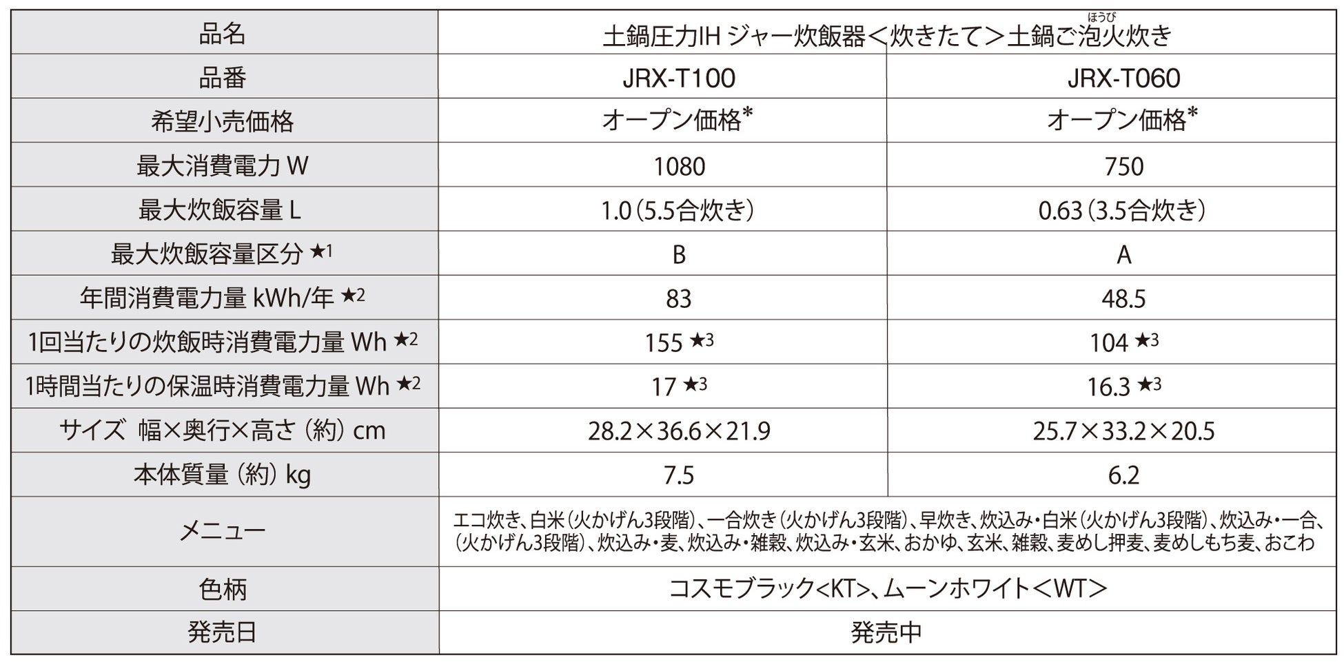 ※1 晋遊舎「MONOQLO」炊飯器部門 BEST BUY OF THE YEAR 2023、晋遊舎「家電批評」 BEST BUY OF THE YEAR 2023 炊飯器部門、宝島社「MonoMax」23.12月号 家電グランプリ 本格派炊飯器大賞、徳間書店「GoodsPress」GoodsPress Award 2023 調理家電部門 炊飯器大賞 ※2 JRX-T100において「白米」メニュー4合、炊きわけ「しゃっきり」、火かげん「強」炊飯時。内なべ外側底面の温度(当社調べ) ※3 従前機種JPL-S100およびJPJ-G060の合計販売台数(2022/6/19~2022/12/3 ※予約販売期間含む)と、JRX-T100およびJRX-T060の合計販売台数(2023/6/19~2023/12/3 ※予約販売期間含む)の比較。(当社調べ)
