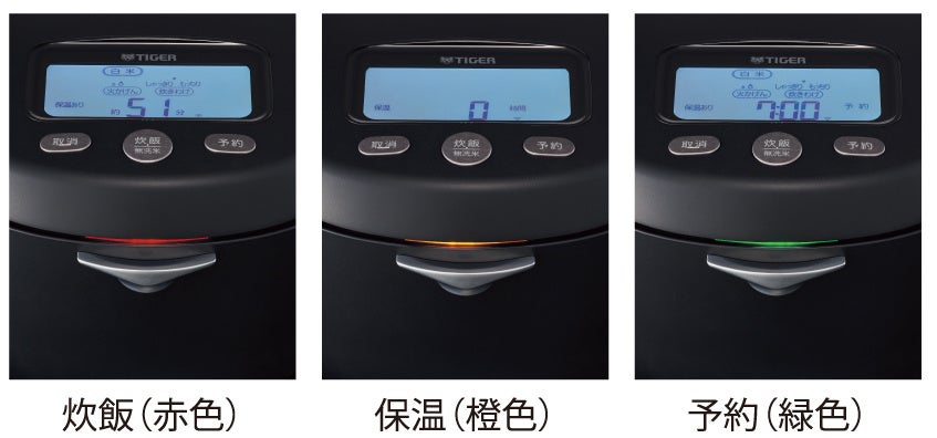 さらに遠くからでもジャー炊飯器の状態がひと目でわかるように、炊飯(赤色)・保温(橙色)・予約(緑色)と状態に合わせて色が変化します。