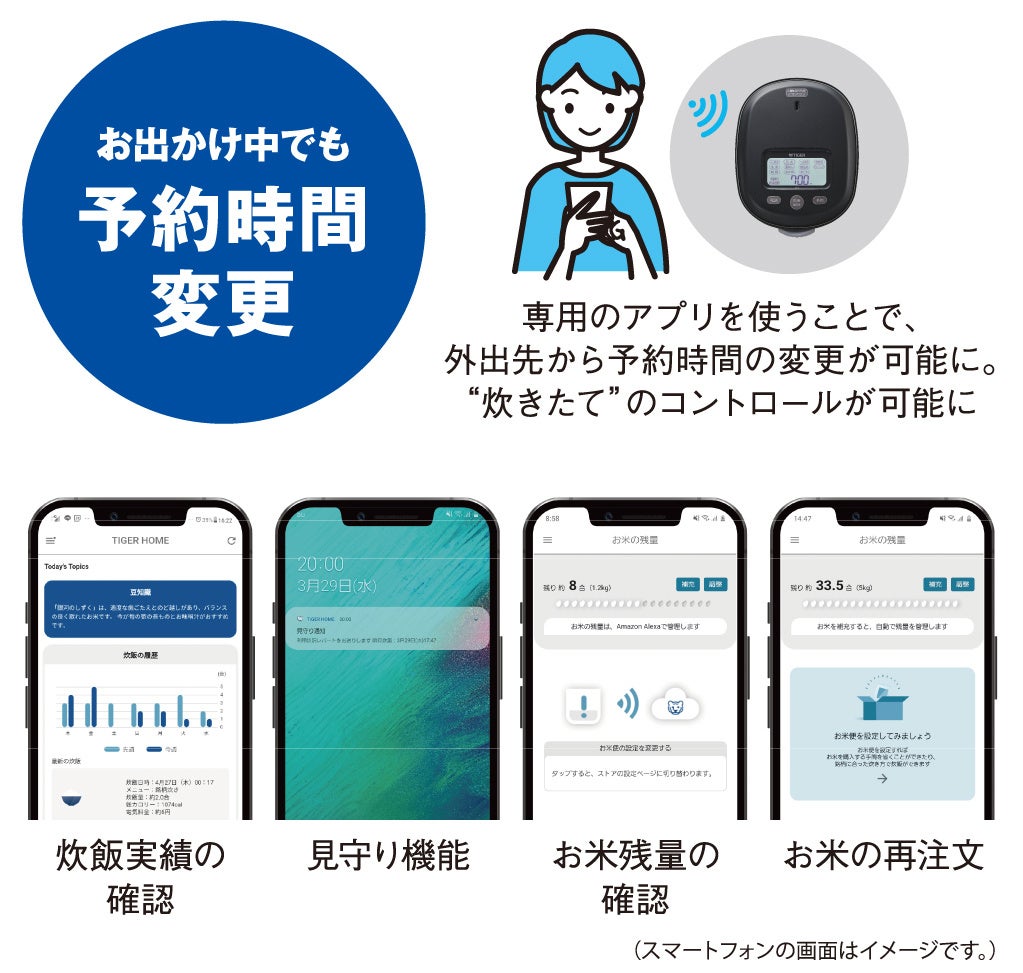 専用の「TIGER HOME」アプリを使うことで、外出先から炊飯予約時間の変更が可能になりました。予定よりも帰宅が早くなった、遅くなった時に炊飯予約時間の変更をすることができます。
