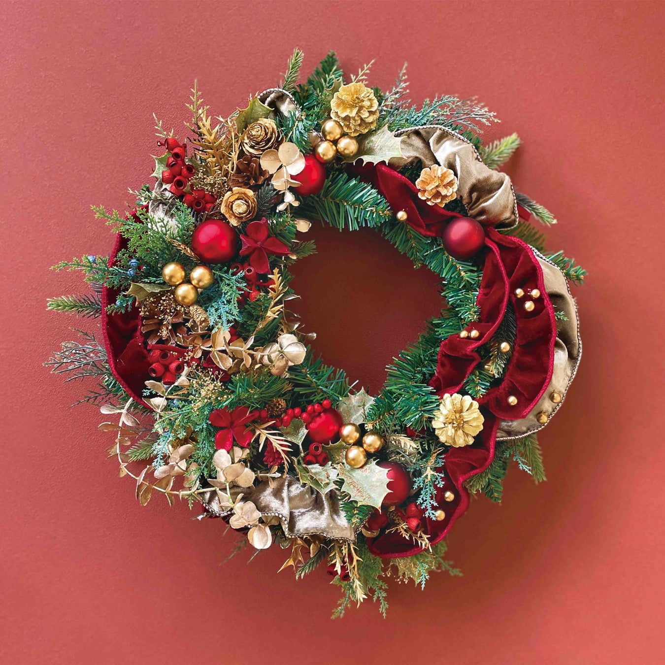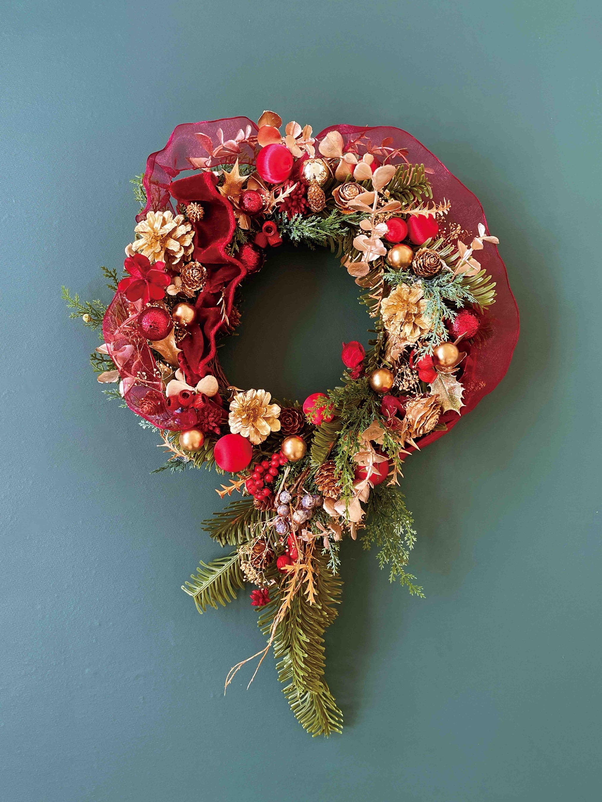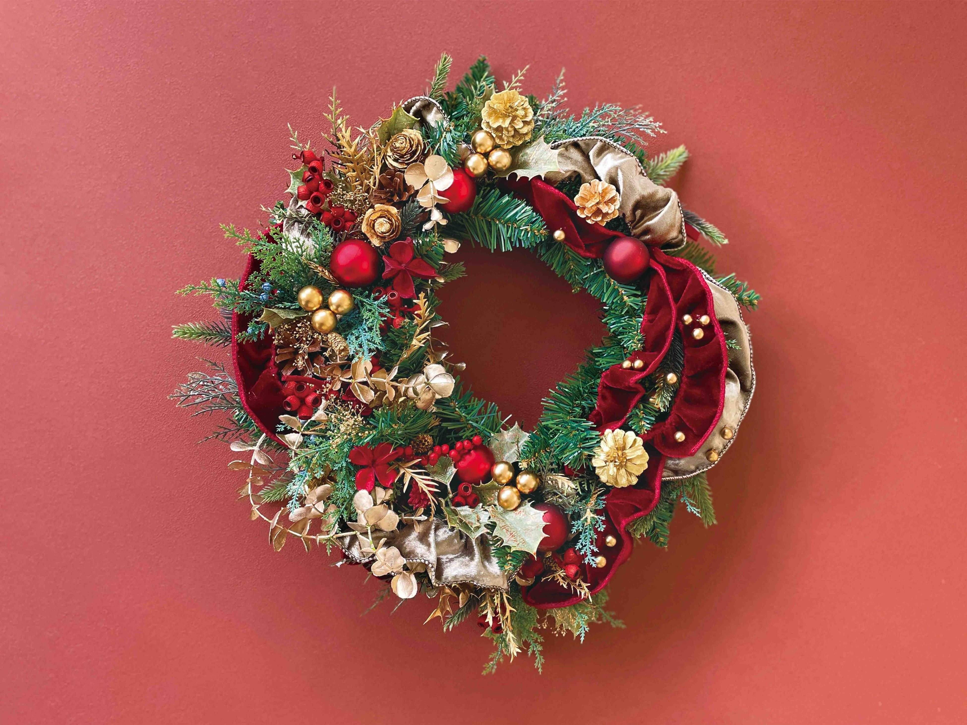 本場ヨーロッパの伝統的なクリスマスを彷彿させる色やデザイン。選りすぐりの素材をふんだんに使ったゴージャスで本格的なリースです。