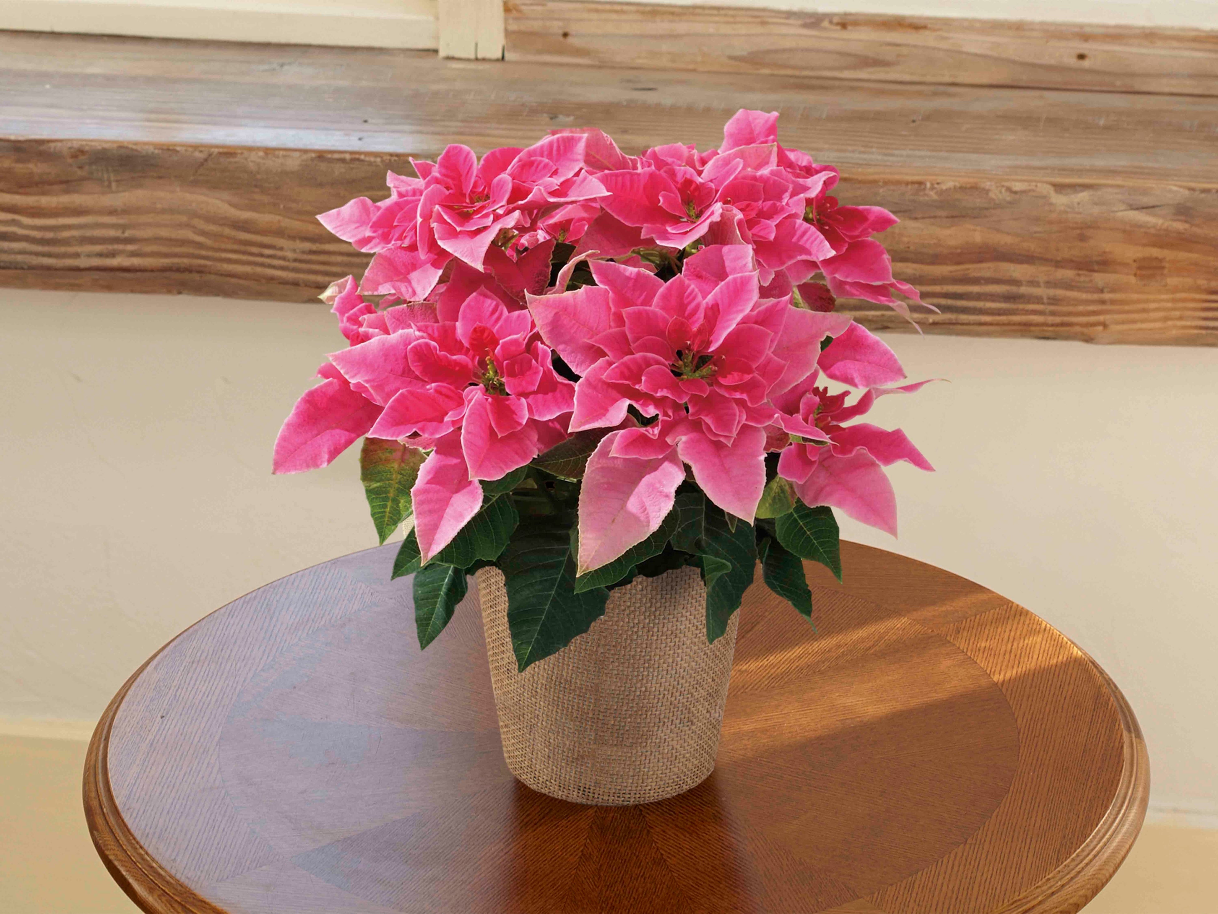プリンセチアはその華やかな印象から「プリンセス」にちなみ名づけられた、ポンセチアの仲間です。「ローザ」はバラのような八重咲きがひときわ目をひく品種です。