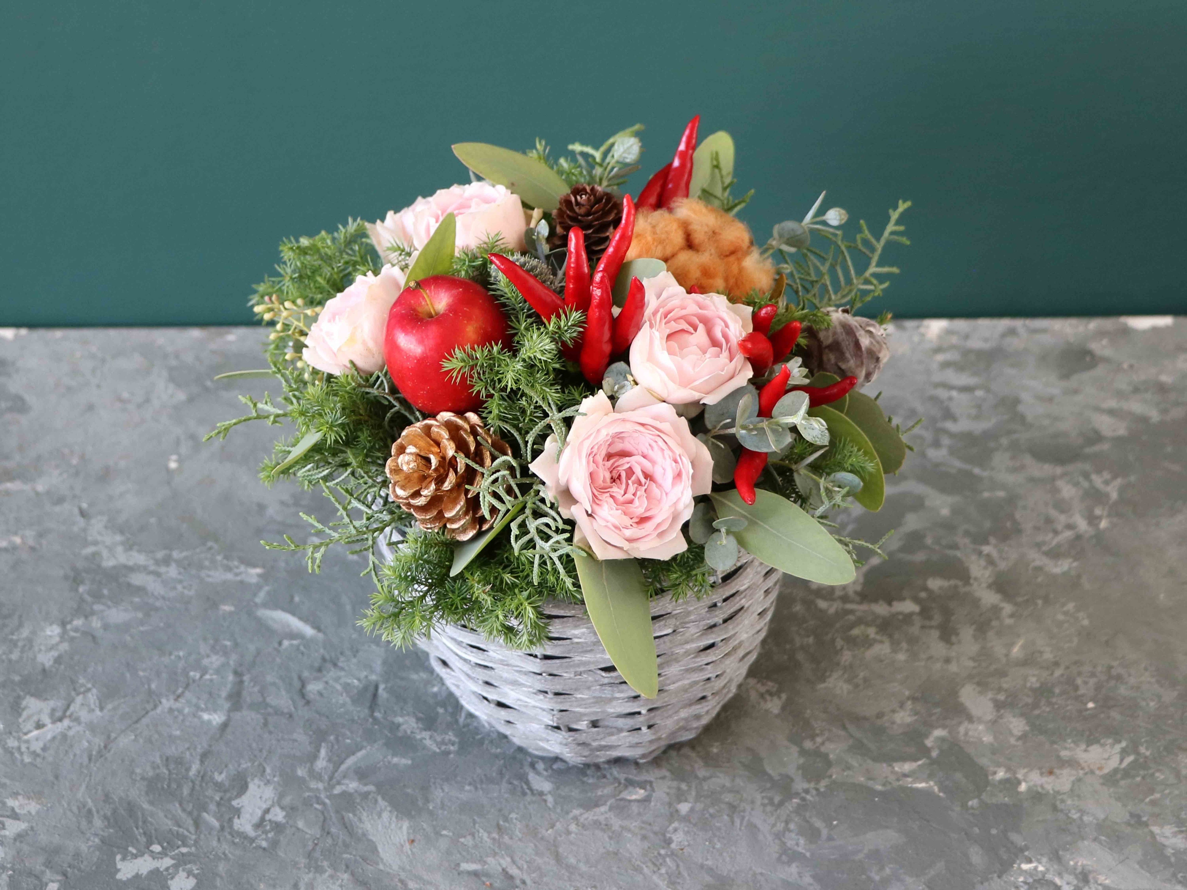 香り豊かな針葉樹に松かさやコットンを入れたクリスマスらしいアレンジメント。バラや実ものなど季節感あふれる旬の花もプラス。フラワーショップ「ビアンカバーネット」のフラワーデザイナーが花とグリーンをミックスし、オシャレな色合いに仕上げました。