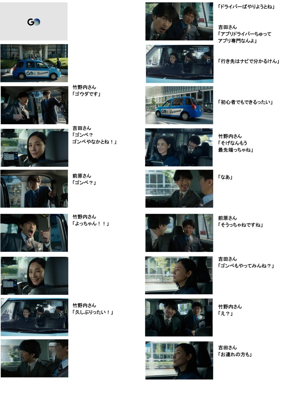 『GO』アプリでタクシーを注文した剛田部長が、偶然「アプリドライバー」として乗務していた故郷・福岡の幼なじみ“よっちゃん”と再会する本作では、竹野内さんが博多弁のセリフに初挑戦。「方言を話す役は俳優人生で3回目」という竹野内さんは博多弁での撮影に臨み、プライベートでも福岡生まれでネーティブな博多弁を話せる吉田さんを相手に、軽快でユニークな掛け合いを披露します。