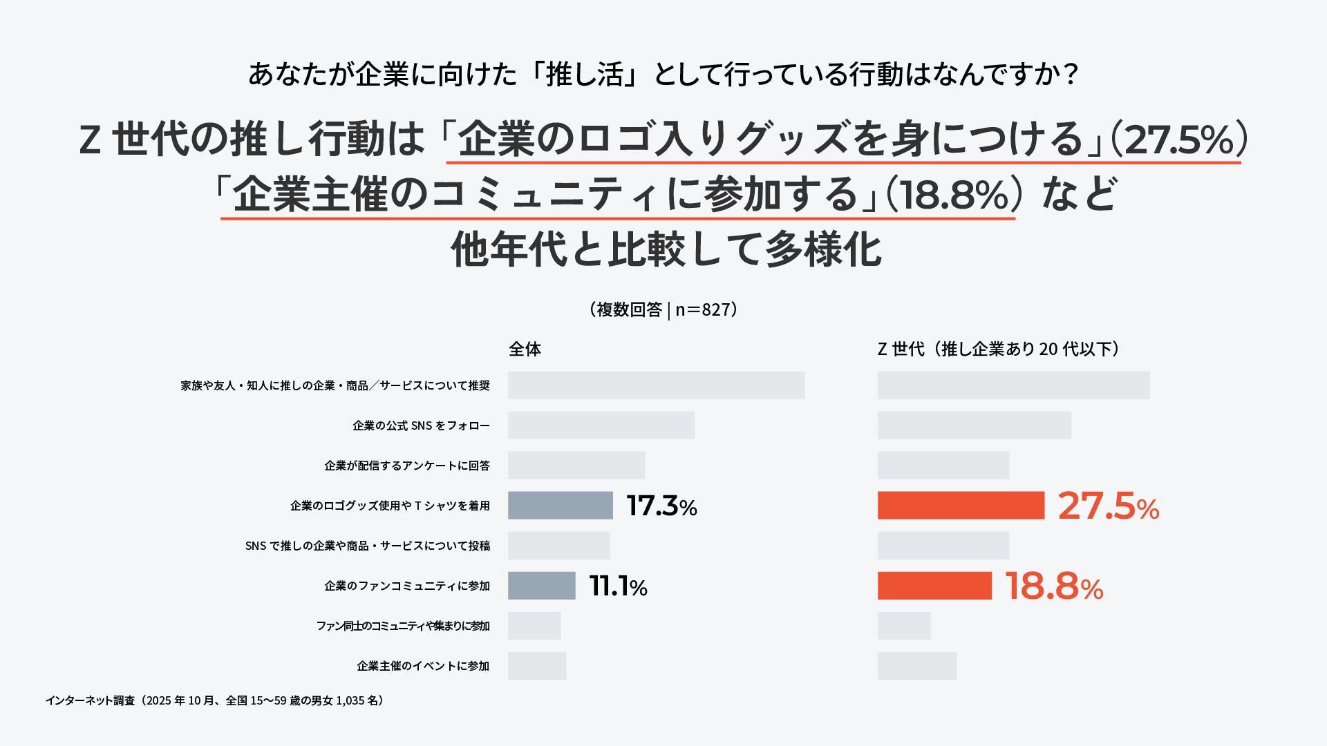推し活の内容としては「家族や友人・知人に推奨」「企業の公式SNSフォロー」が上位に挙がる結果に。一方で、Z世代の推し行動は「企業のロゴ入りグッズを身につける」(27.5%)「企業主催のコミュニティに参加する」(18.8%)など他年代と比較して多様化。
