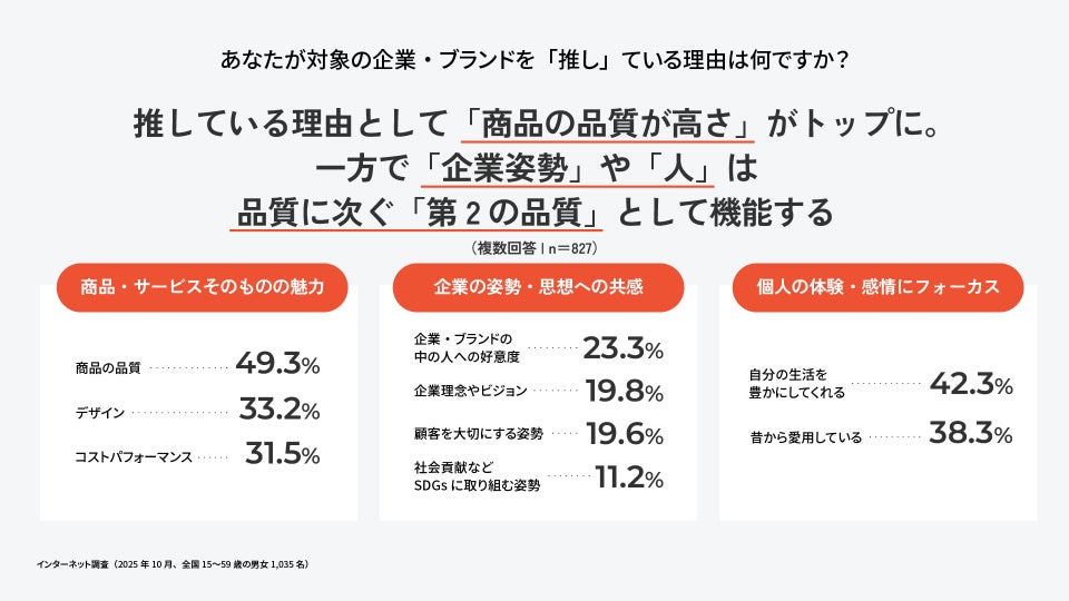 推している理由として、「商品の品質が高さ」がトップに。一方で、「企業姿勢」や「人」は、品質に次ぐ「第2の品質」として機能する。