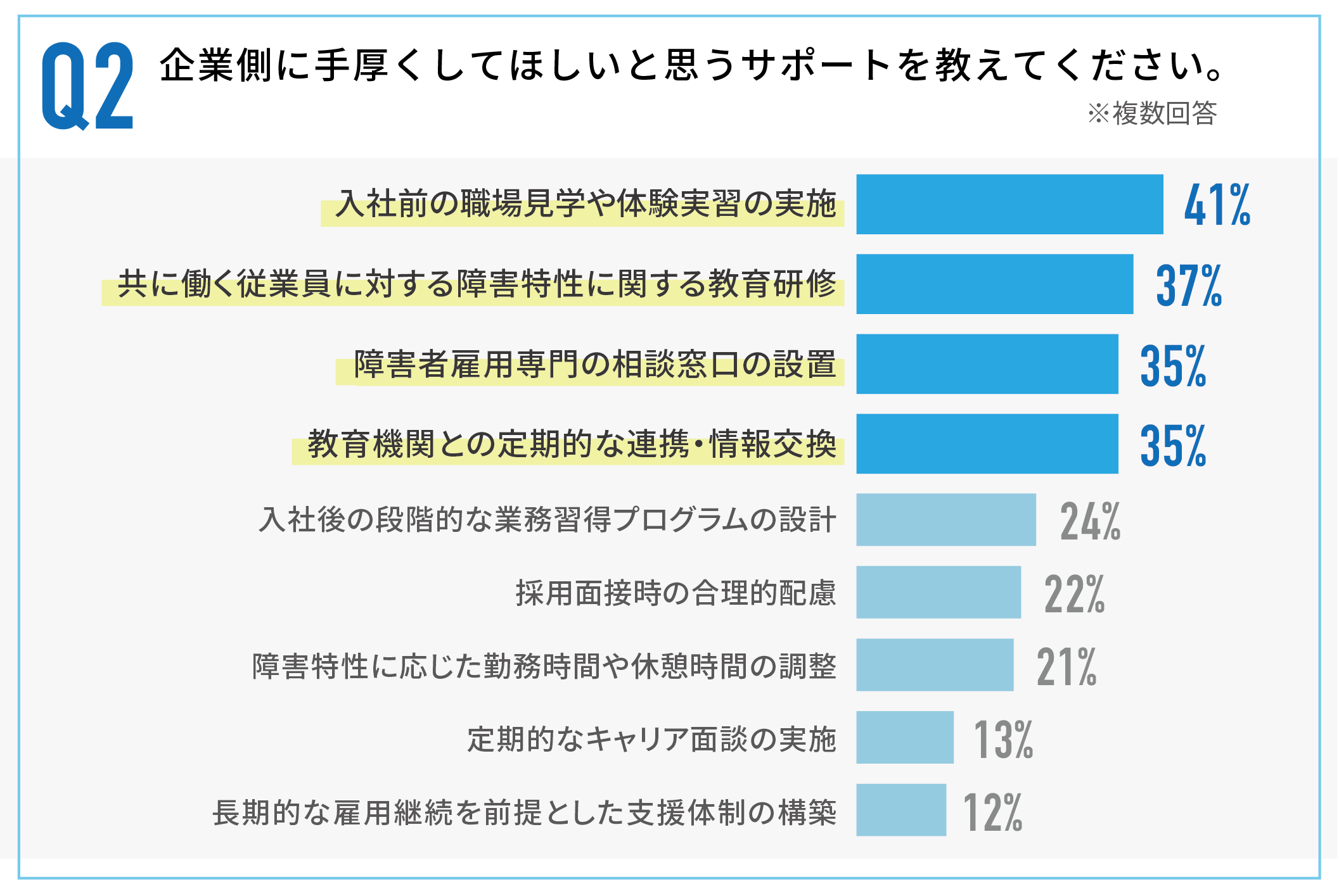 企業側に手厚くして欲しいと思うサポートについて伺うと、「入社前の職場見学や体験実習の実施」が41%で最多の回答となりました。次いで「共に働く従業員に対する障害特性に関する教育研修」が37%、「障害者雇用専門の相談窓口の設置」と「教育機関との定期的な連携・情報交換」が35%と同率の回答でした。