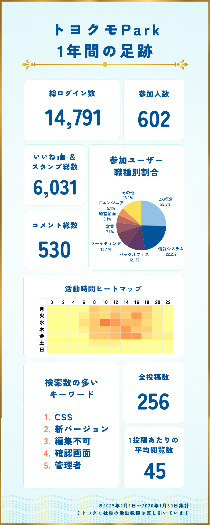 活発な相互支援: 投稿256件に対し、530件のコメント、6,031個のリアクションが寄せられ、オンラインの壁を超えたコミュニケーションが広がっています。
