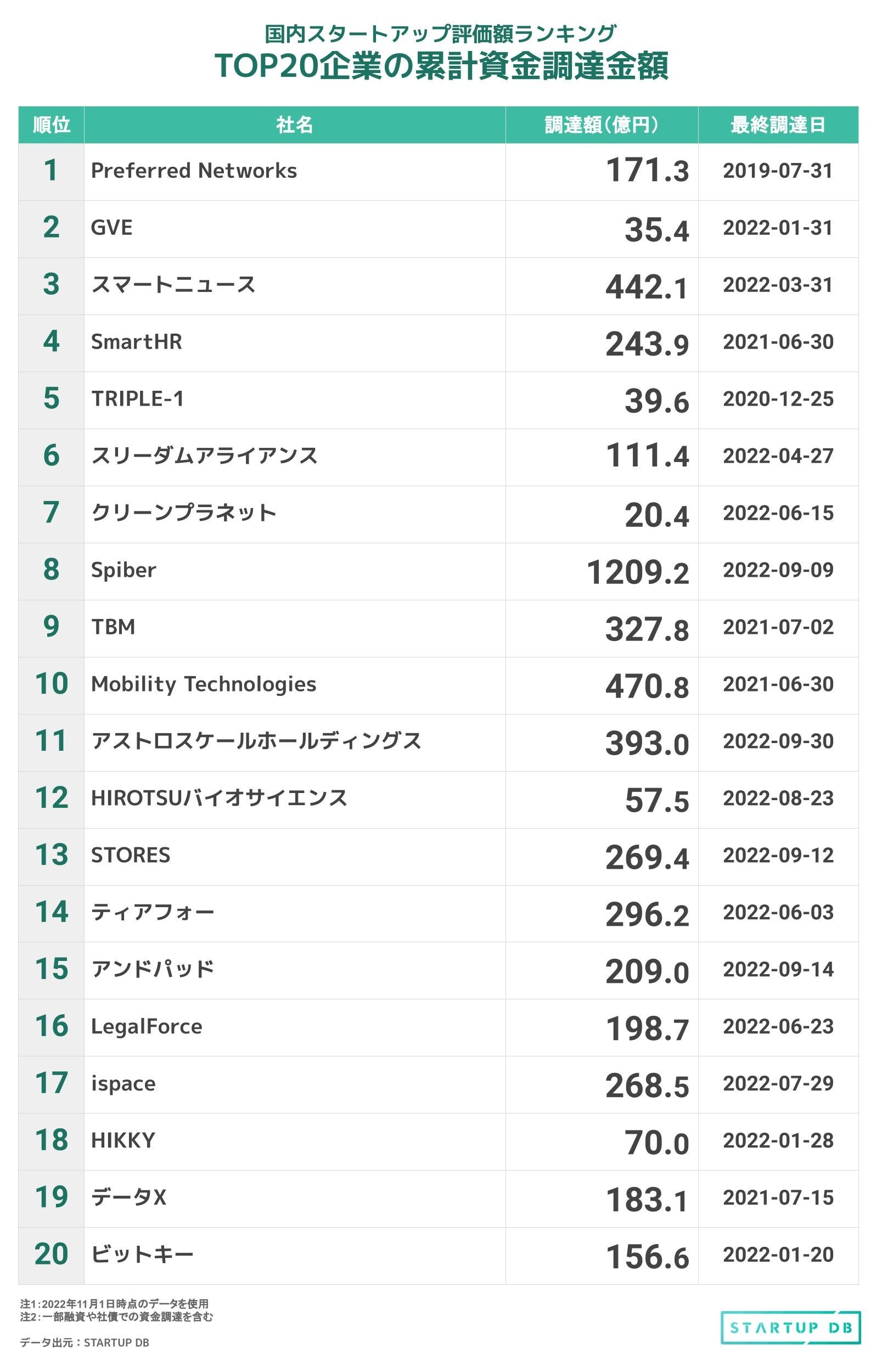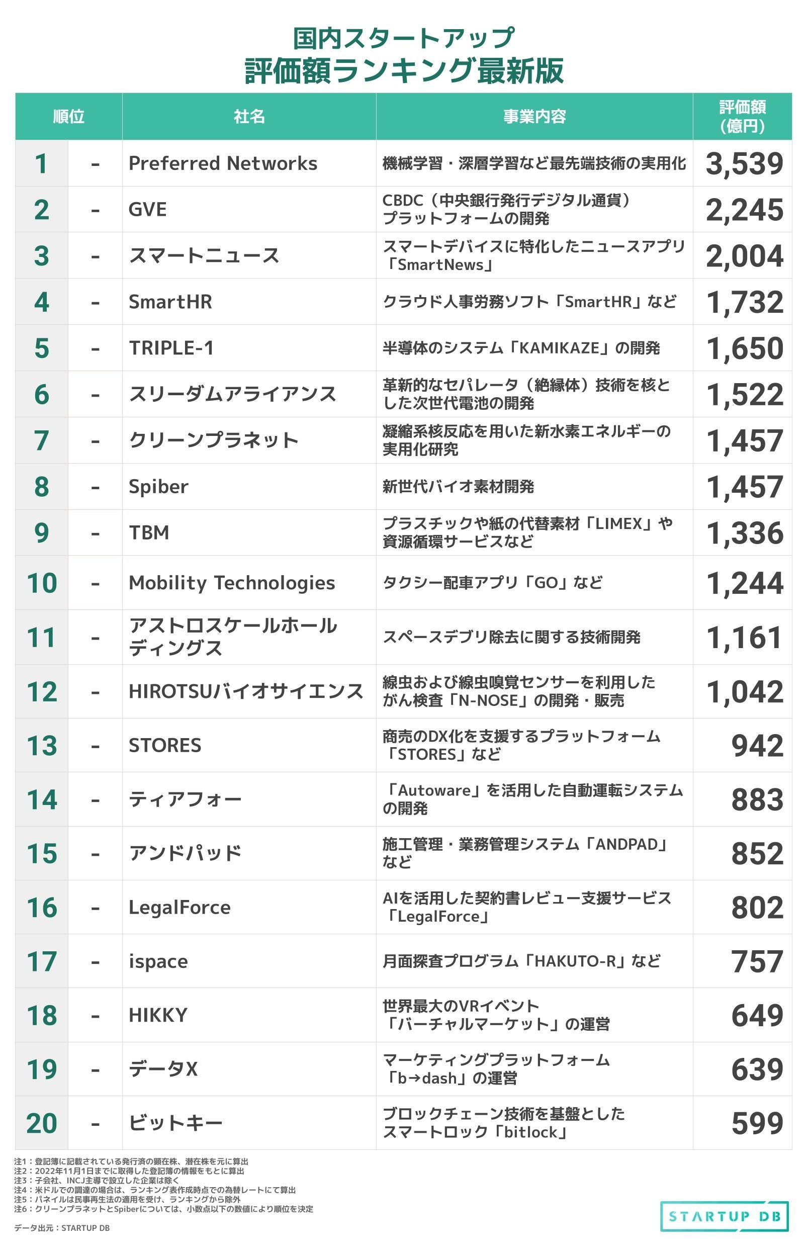 【STARTUP DB】調査結果 国内スタートアップ評価額ランキング最新版(2022年11月)