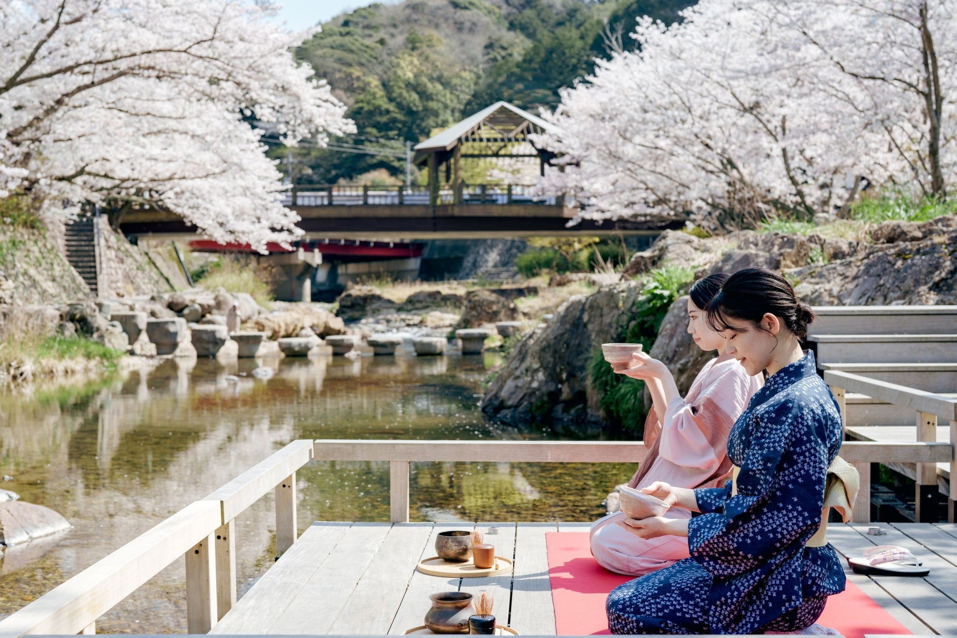 長門湯本温泉街には、音信川を挟むように宿が軒を連ね、川沿いには桜が立ち並び、3月末から4月上旬にかけての桜の開花時期には、多くの観光客がその桜並木に魅了されています。界 長門では宿泊者専用の川床テラスを貸切り、ご当地のうつわを使用した春ならではの贅沢な野点体験を提案します。