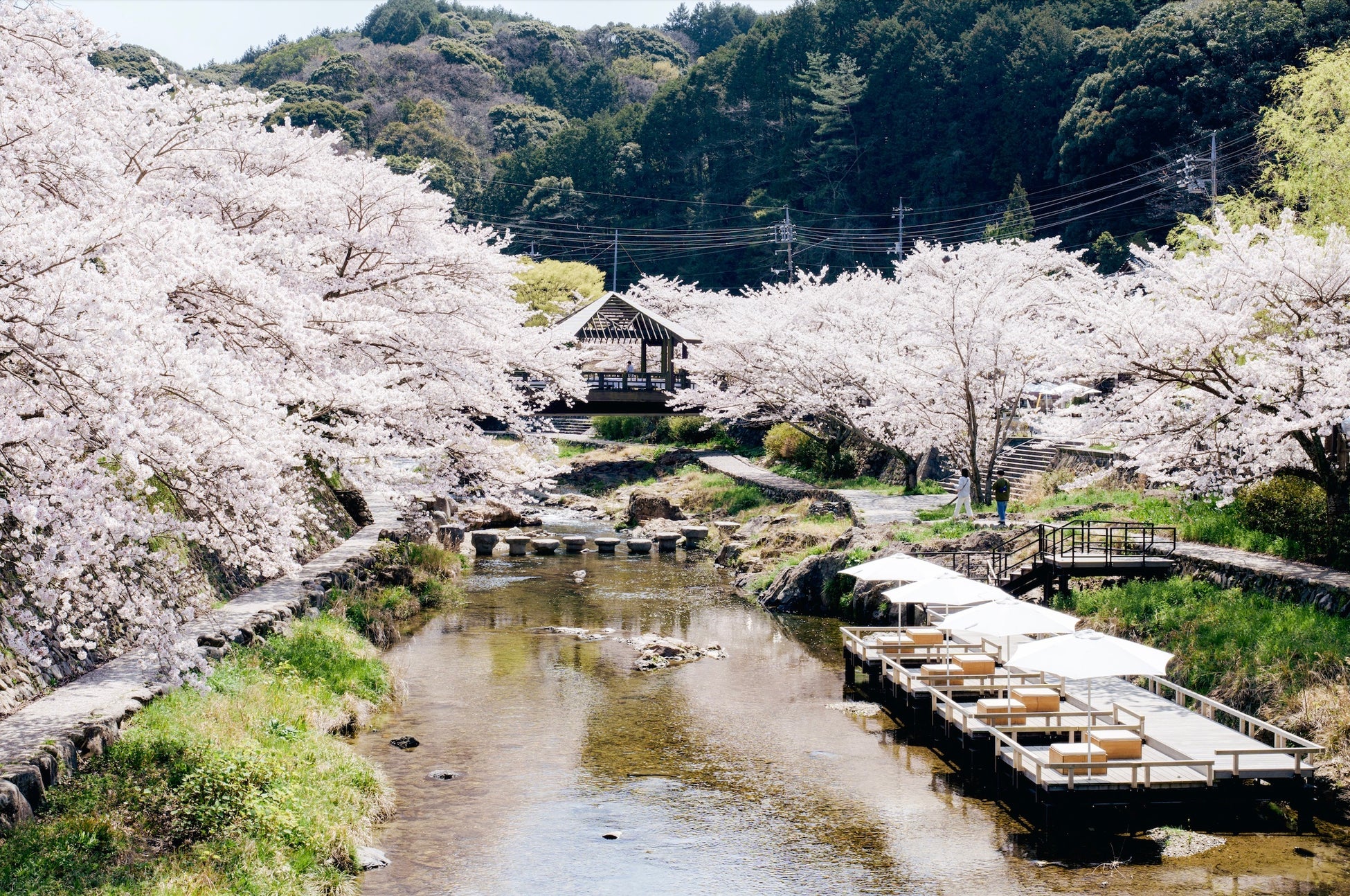界 長門の目の前にある宿泊者限定の川床テラスを1日2組限定で貸切り、長門湯本温泉の中央に流れる「音信川(おとずれがわ)」の水面に浮かぶ花筏や満開の桜並木の景色を眺められる特等席を用意します。