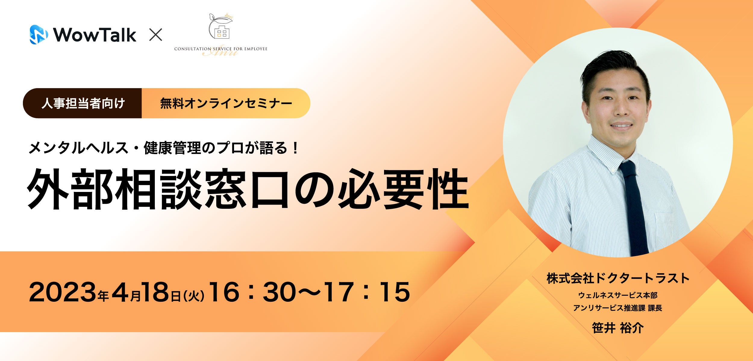 利用社数10,000社超と多くのビジネスパーソンにご利用いただいているサービス、ビジネスチャット・社内SNS「WowTalk(ワウトーク)」を開発・提供するワウテック株式会社(本社:東京都港区、代表取締役社長:瀬沼 悠)は、「外部相談窓口の必要性について」をテーマとした株式会社ドクタートラスト(本社:東京都渋谷区、代表取締役社長:高橋 雅彦)との共催ウェビナーを、2023年4月18日(火)16:30より開催いたします。