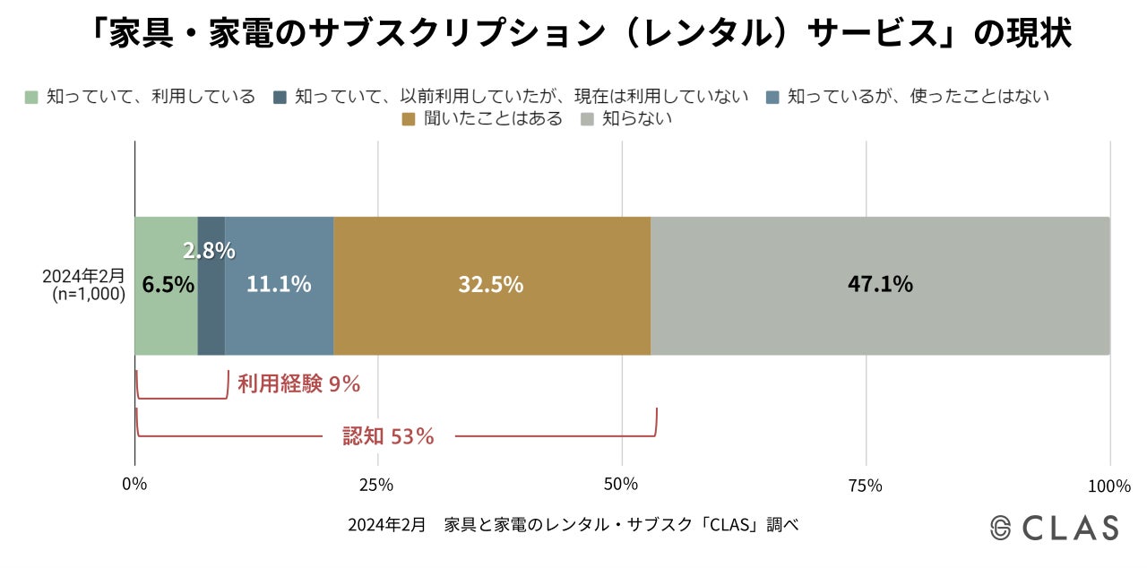 また、「家具・家電のサブスクリプション(レンタル)サービス」を利用経験のある方は9%、知っている人、聞いたことはある人を含めると全体の半数以上の53%が認知しており、家具や家電を「購入せずに利用する」、レンタル・サブスクの定着化がうかがえます。