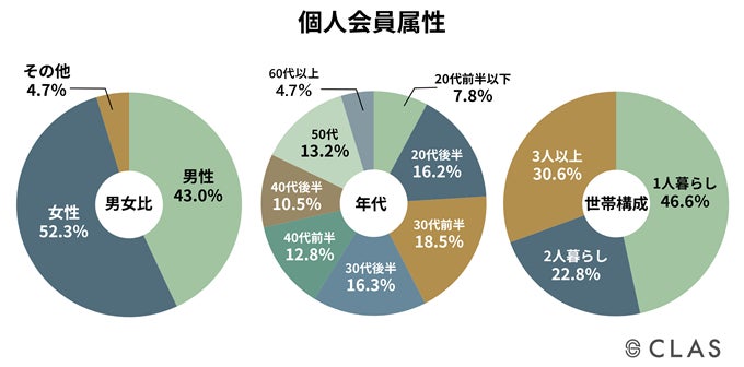 ライフスタイルやライフステージが変化しやすい、20代以下(24.0%)、30代(34.8%)、40代(23.3%)の1人暮らし世帯を中心としつつ、50代~60代以上の方の登録も増え、より幅広い年代の方が家具や家電を「所有せず、利用する」という選択をしています。