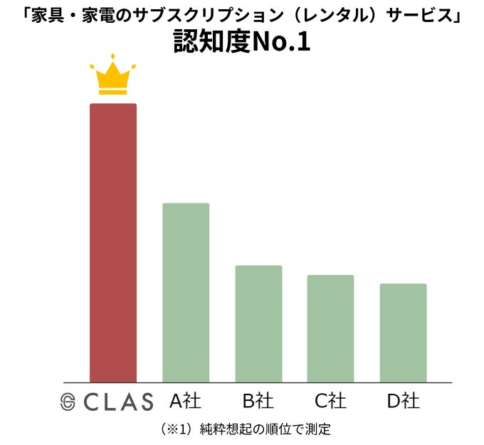 2024年2月にCLASサービス提供地域(東京都・神奈川県・千葉県・埼玉県・大阪府・京都府・兵庫県)の18歳~49歳の男女1,000人を対象に実施した「家具・家電のサブスクリプション(レンタル)サービス」に関するアンケート(実施主体:株式会社クラス、調査機関:Freeasy)において、家具と家電のレンタル・サブスク「CLAS」が2年連続で認知度No.1(※1)に選ばれました。