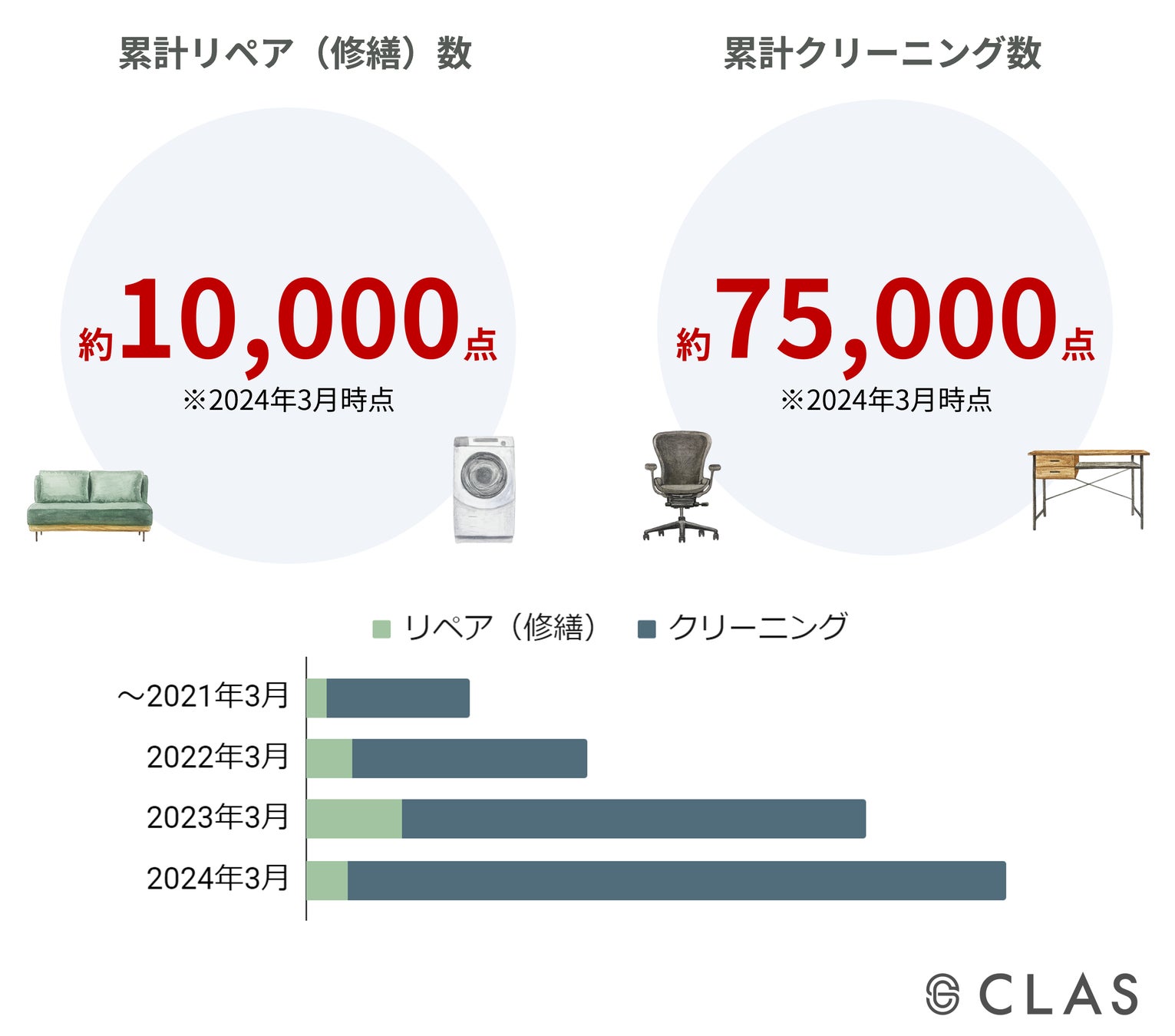 2024年3月までの累計リペア(修繕)数は約1万点、累計クリーニング数は約7万5,000点。CLASではこれまで、実に約8万5,000点の家具や家電を廃棄せず、新品同様にリペア・クリーニングを施して再利用してきました。