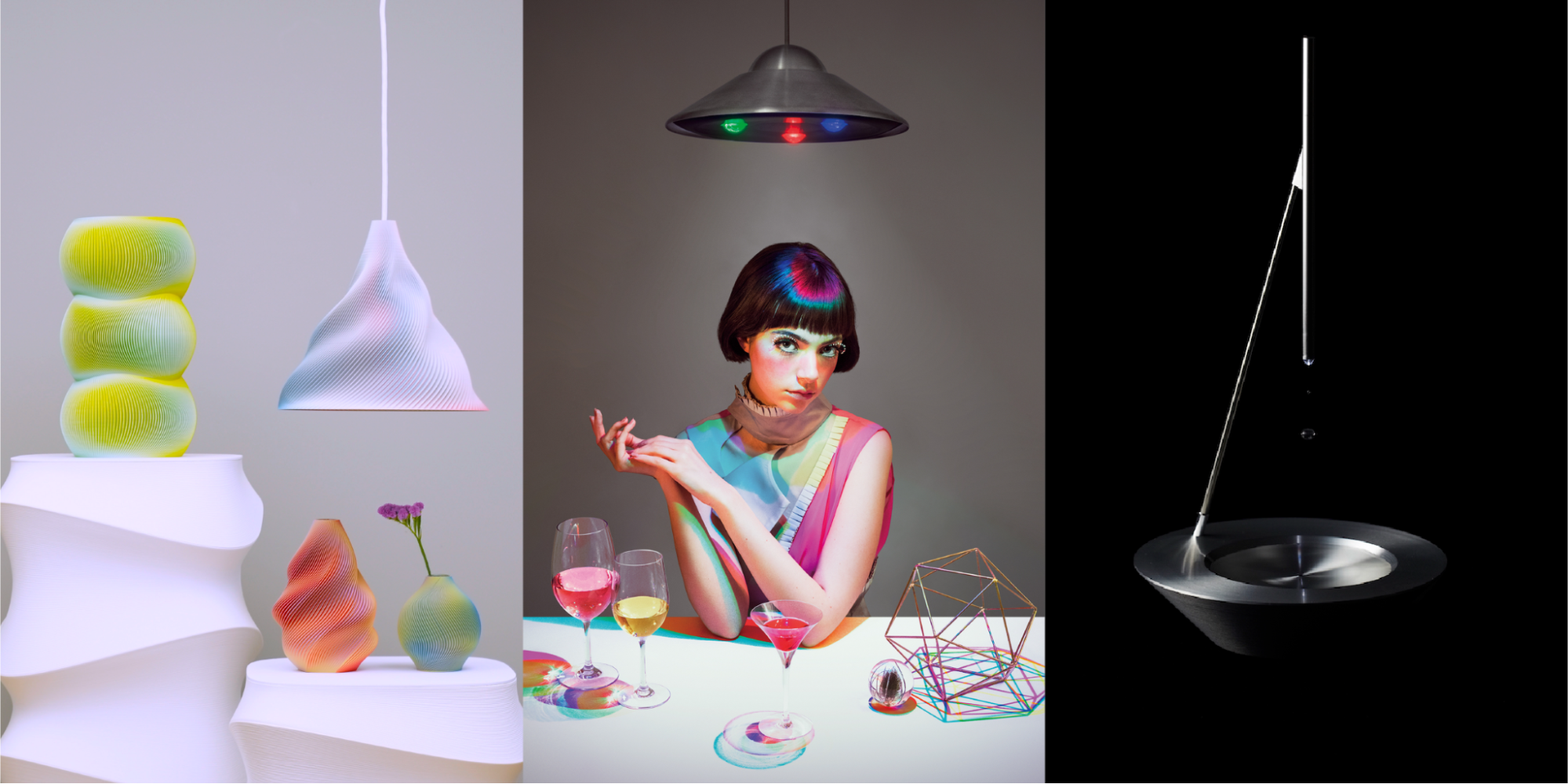 光の三原色の原理を応用し、白い光の中に彩る影をつくるペンダントライト。「影の色をデザインする」という新感覚のこの照明器具は、光の現象を身近に出現させ、影の概念に新しい価値観を提案。アナログな現象は、店舗、家庭、イベントスペース、学校など様々な場面でエモーショナルな空間を演出します。