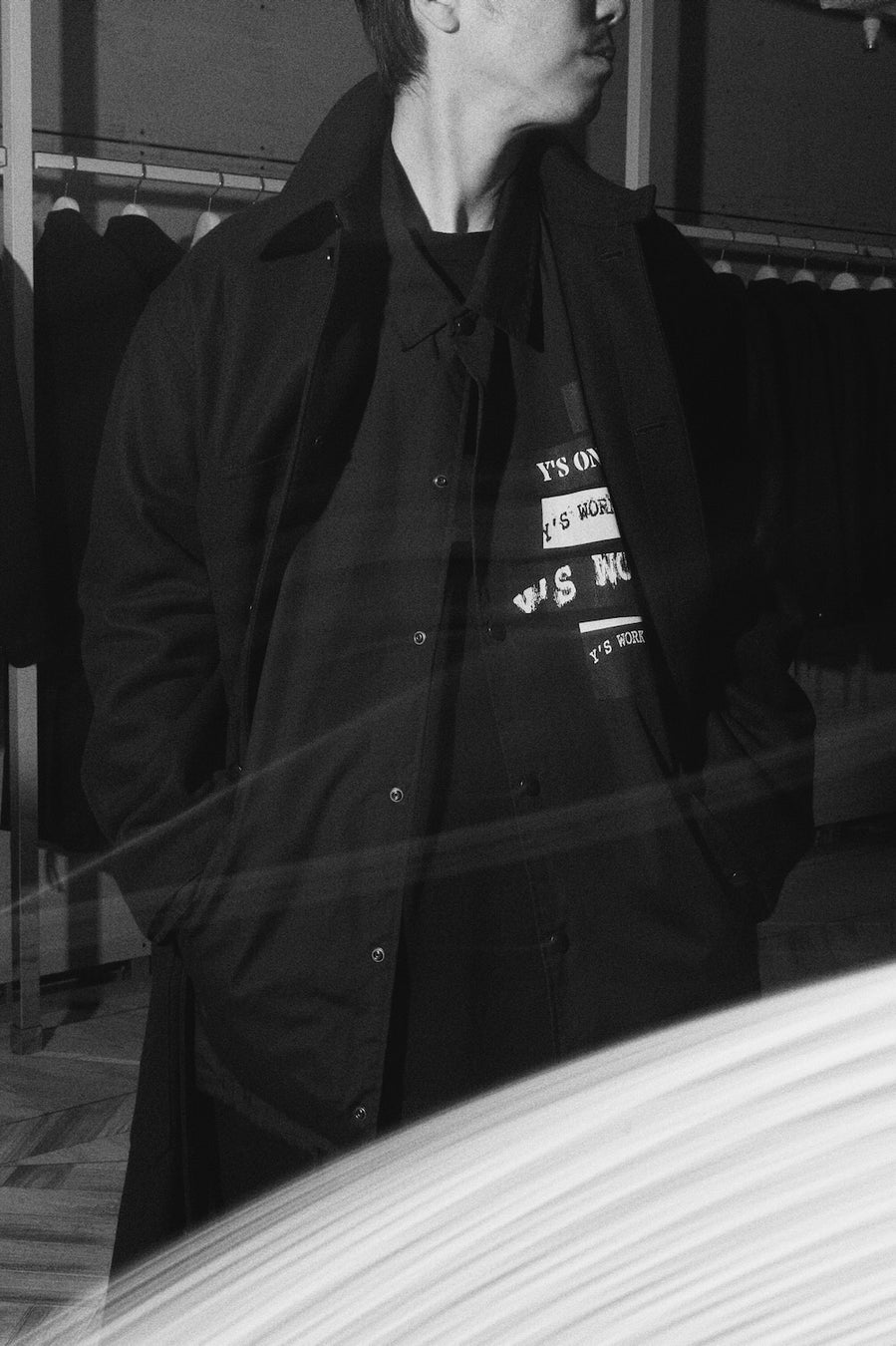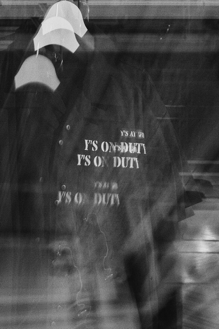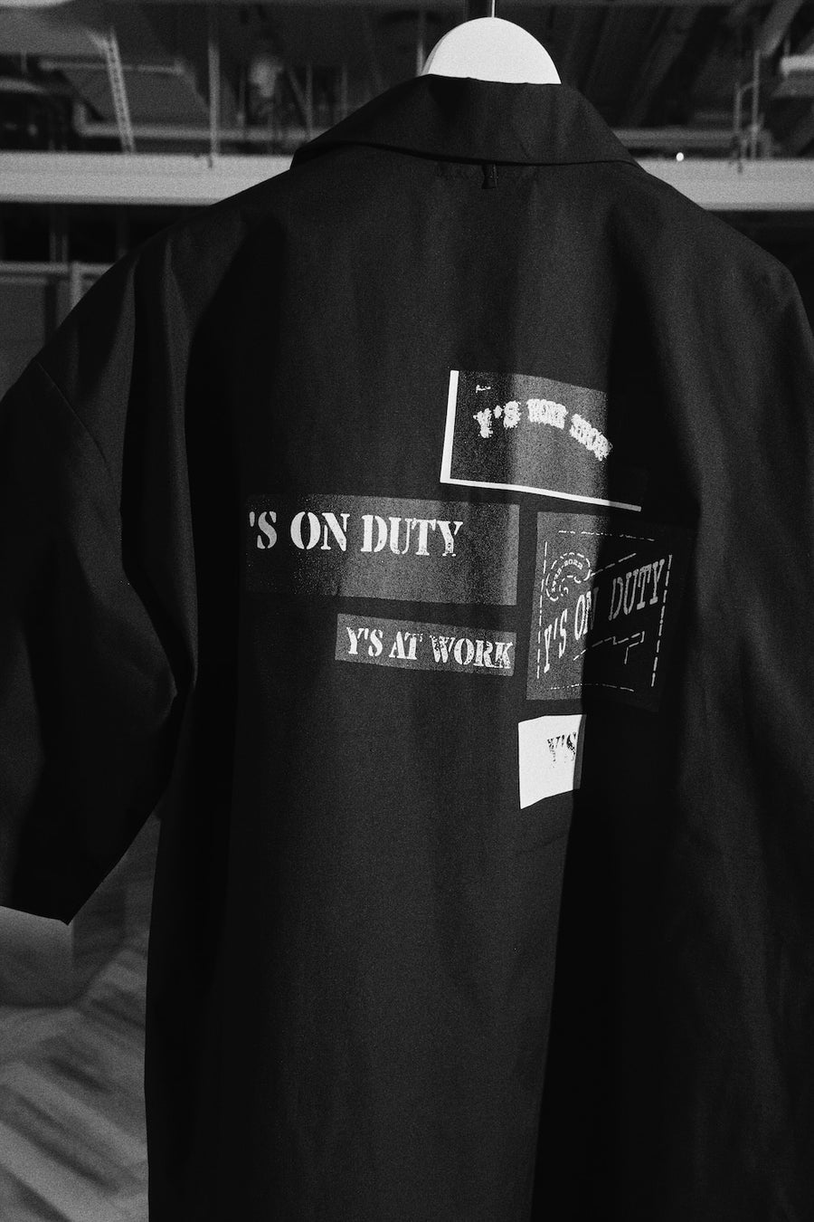 Y's for menのアーカイブ・グラフィックが配されたファーストエディション。ブラック&ホワイトのコレクションはグラフィックの興味深い構成を引き立て、ワークウェアのタフで動きやすいシルエットに完成度を加えます。