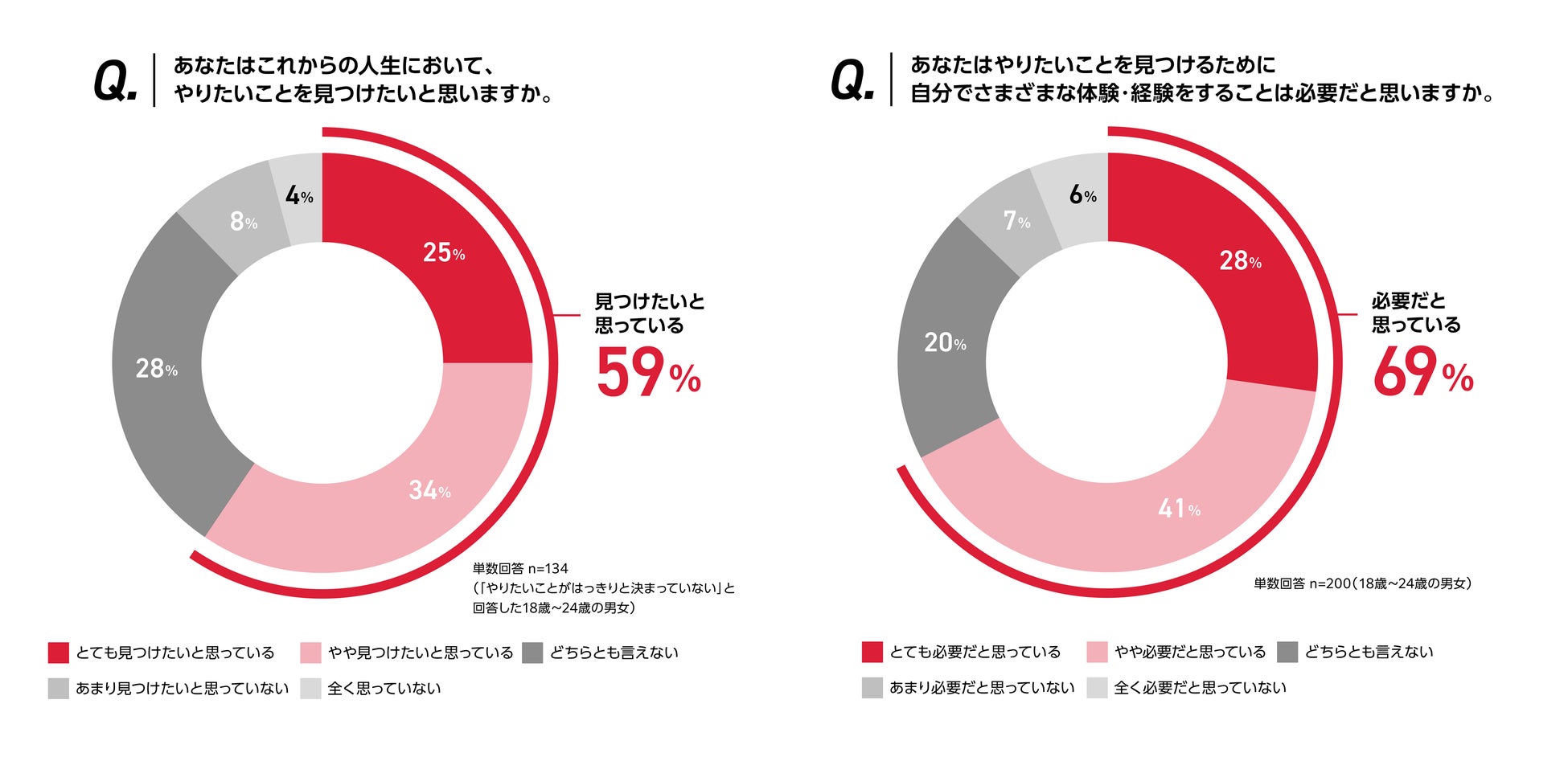 ・18歳~24歳の次世代層では、約60%が「やりたいことを見つけたい」と感じ、また、約70%がやりたいことを見つけるのに体験機会が必要と回答