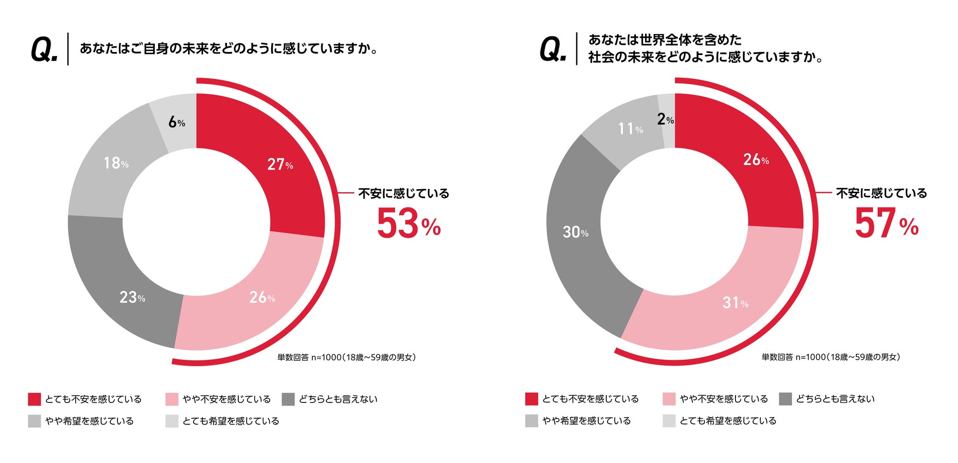 当社が18歳から59歳を対象に実施した未来に関する意識調査では、50%以上が自身や社会の未来に「不安を抱えている」と回答しました。一方で、このような状況の中でも未来を担う18歳から24歳の次世代層は、約60%が「やりたいことを見つけたい」と感じていることが分かりました。さらに次世代層の約70%がやりたいことを見つけるために体験機会が必要と考えていることも明らかになりました※2。
