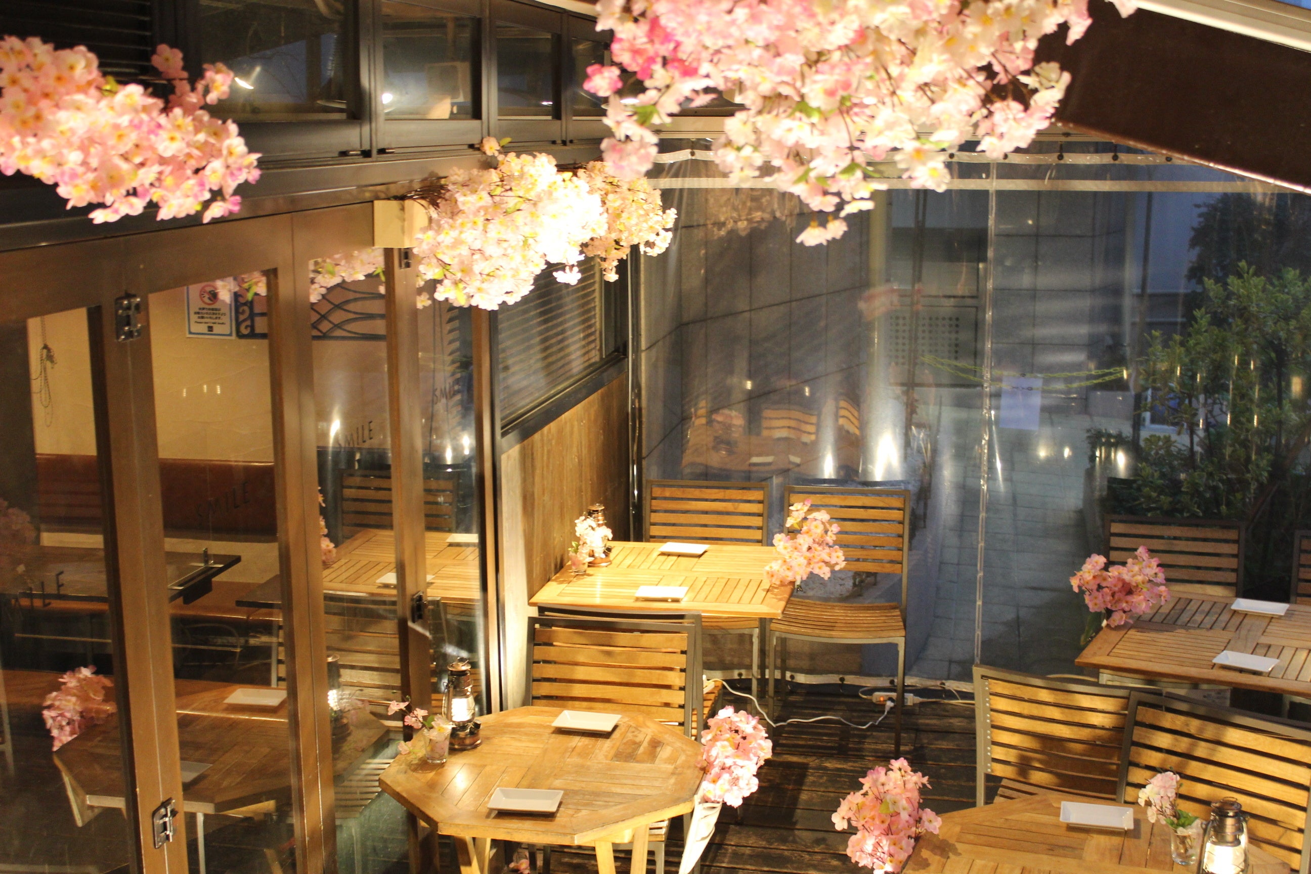 - もっと春のお祝い気分を満喫できるテラスで花見焼き鳥。