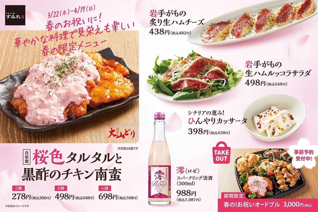 自家製 桜色タルタルと黒酢のチキン南蛮で春のお祝い気分満開!お家でも華やかな食卓を…春のお祝いオードブル。やきとり家すみれ全店で春限定メニューを3月22日より販売。さらに学芸大学店でテラスで花見焼き鳥