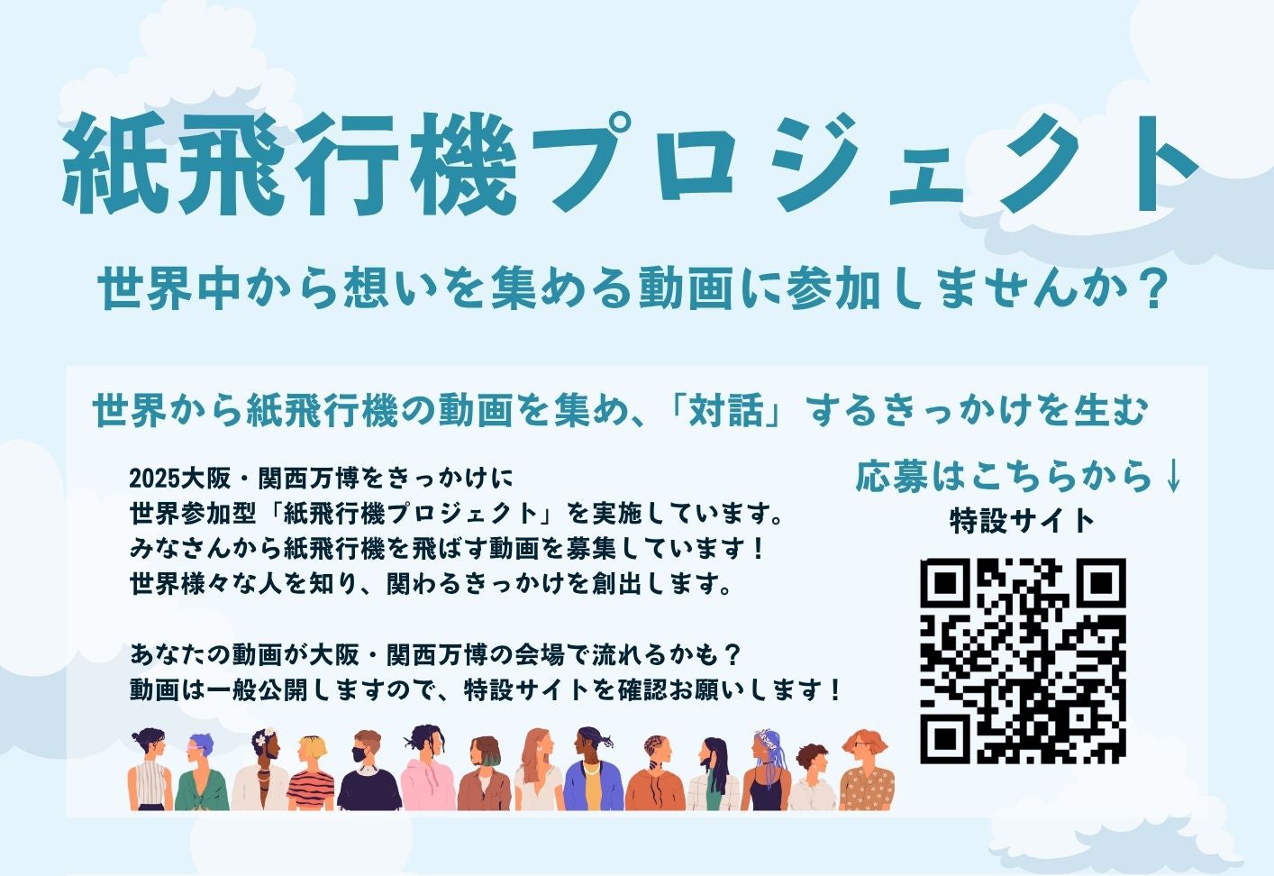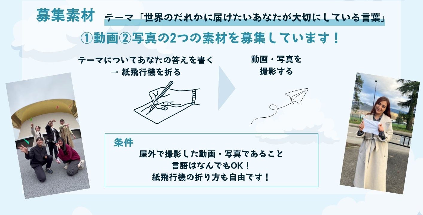 大阪・関西万博を好機に、国籍や性別、障害の有無などを超えて、人々が互いの違いを認め合い、共生社会を目指すことを目的とした学生主体の映像プロジェクト。「世界の誰かに届けたい大切な言葉」をテーマにした紙飛行機を飛ばす動画やメッセージ写真を世界各国から募り、それを学生クリエイターが映像作品として編集、2025年7月、9月に万博会場で上映予定です。