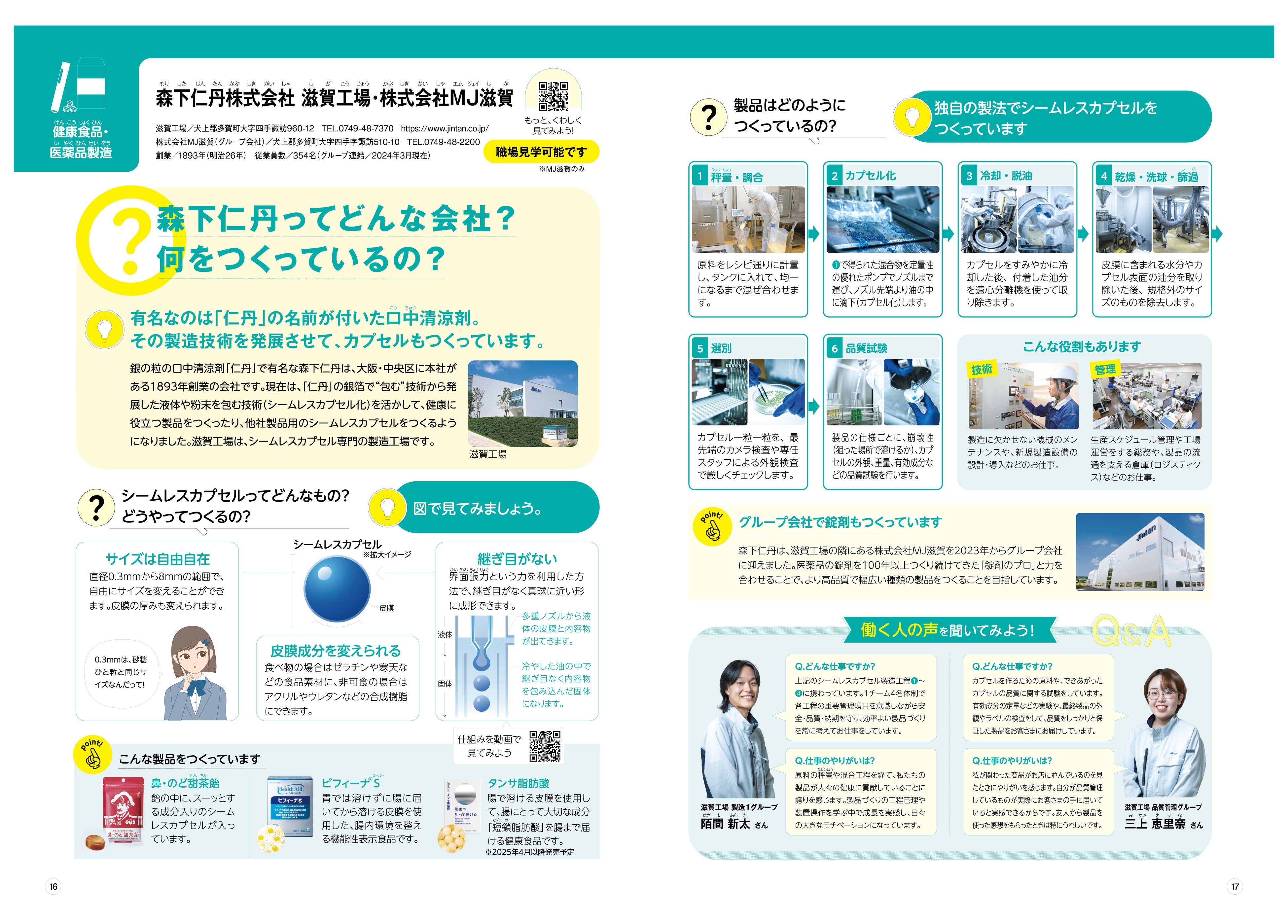 掲載ページでは、当社独自の球体技術であり、滋賀工場で製造するシームレスカプセルの製造工程をはじめ、滋賀工場およびグループ会社のMJ滋賀で働く技術職や管理職の仕事内容、従業員インタビューを通じて製薬業界の魅力や働く人々のリアルな声を紹介することで、中学生の皆さんが選択肢を拡げ、自分らしい未来を切り開いていけるよう将来のキャリアを考えるきっかけを提供します。
