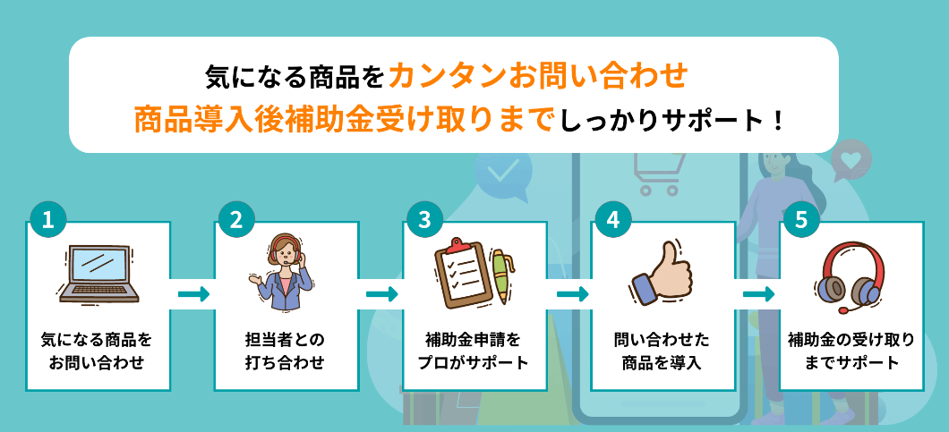 「みんなの補助金マーケット」では、お客様が補助金・助成金の手続きをストレスなく、スムーズに商品の購入と補助金の受給が行えるよう、専門的なサポートを提供しています。