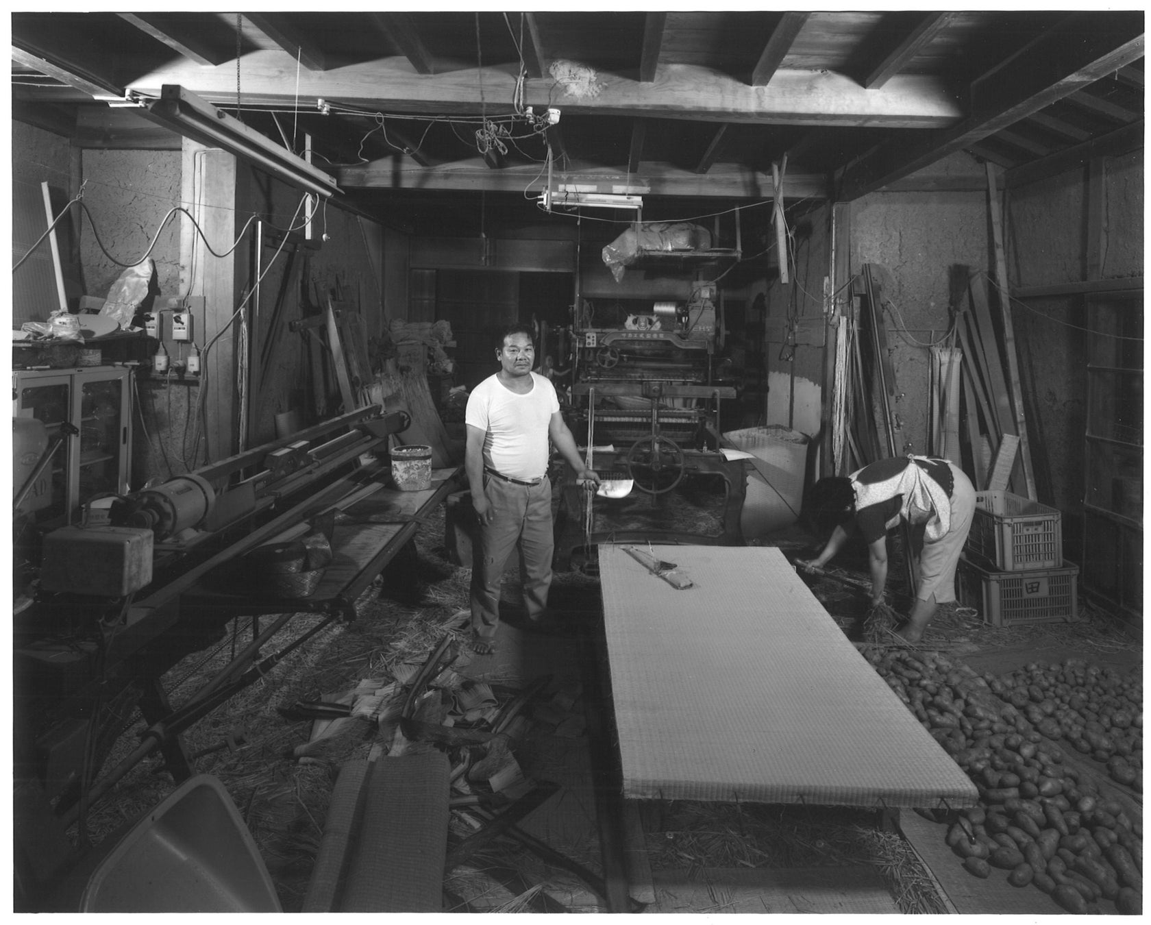 〈田淵畳店/鳥取県八頭郡河原町渡一木/1985(昭和60)年/近郷では知られた畳作りの名人。発砲スチロールやナイロンの畳の多い中、昔ながらのい草で、畳作りを続ける。右下に写っているジャガイモをお土産に頂いた。〉