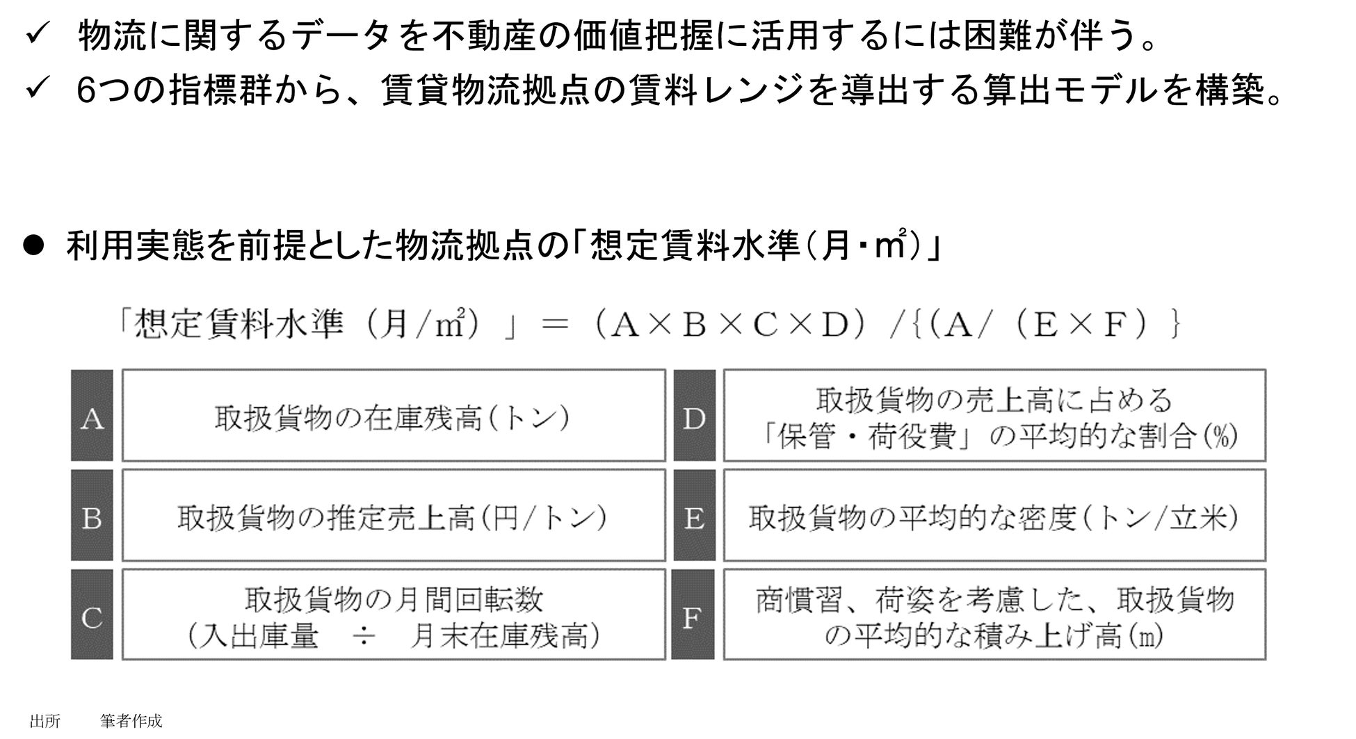 本レポートでは、6つの指標群から、賃貸物流拠点の賃料レンジを導出する算出モデルを構築。