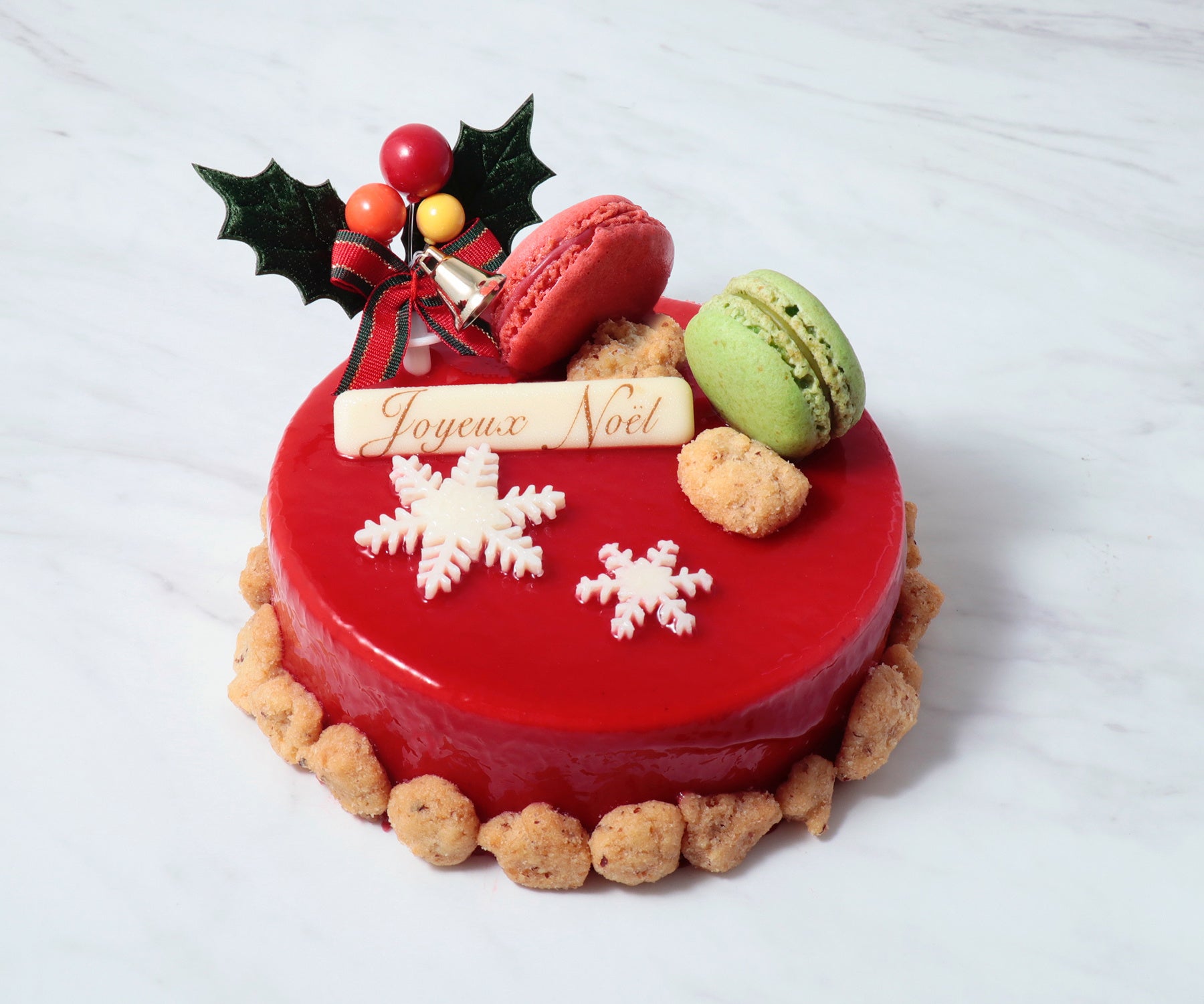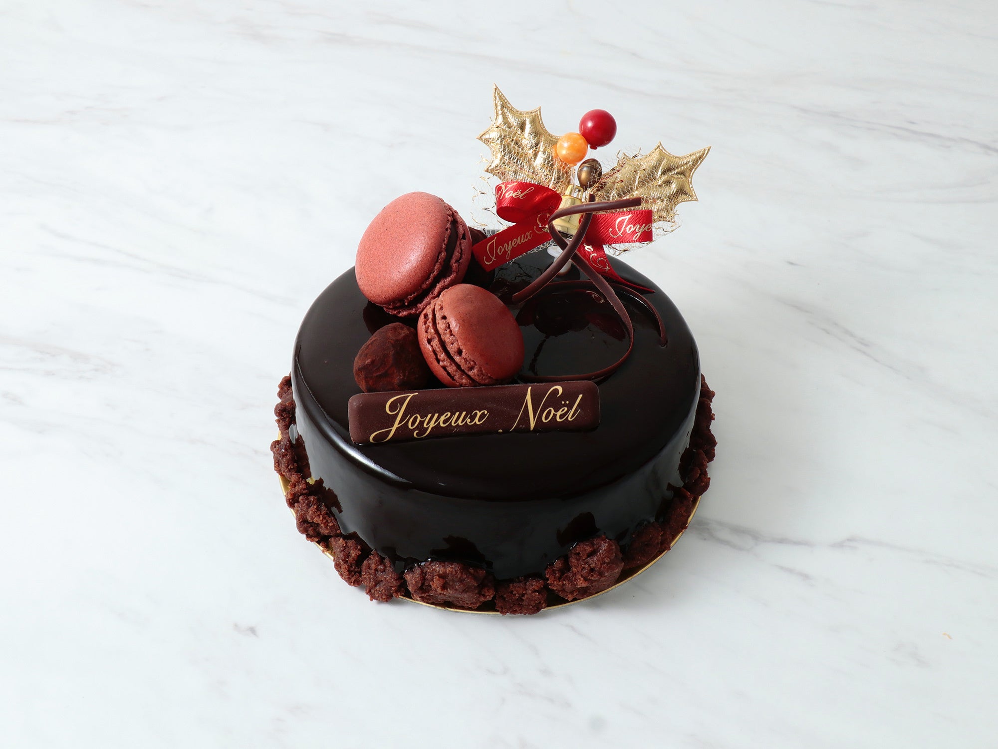 トップには、ショコラ味のマカロンやトリュフキャラメル、ヒイラギのピックを飾り、艶やかなグラサージュが一層目を引く仕上げに。