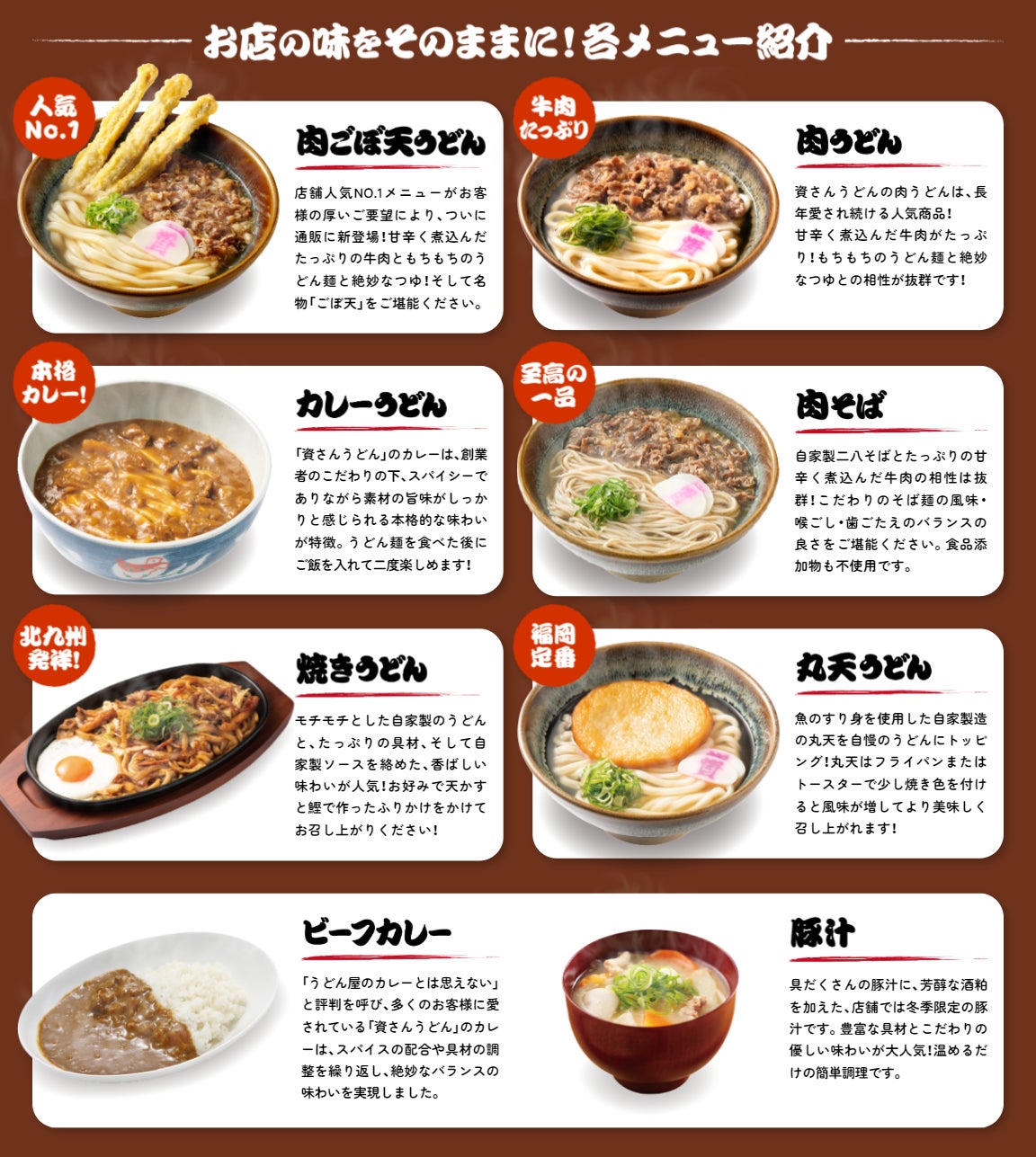 資さんうどん公式通販サイト「資さんストア」は、「資さんうどん」の味をご家庭で味わうことが出来ると、多くのお客様にご利用いただいております。