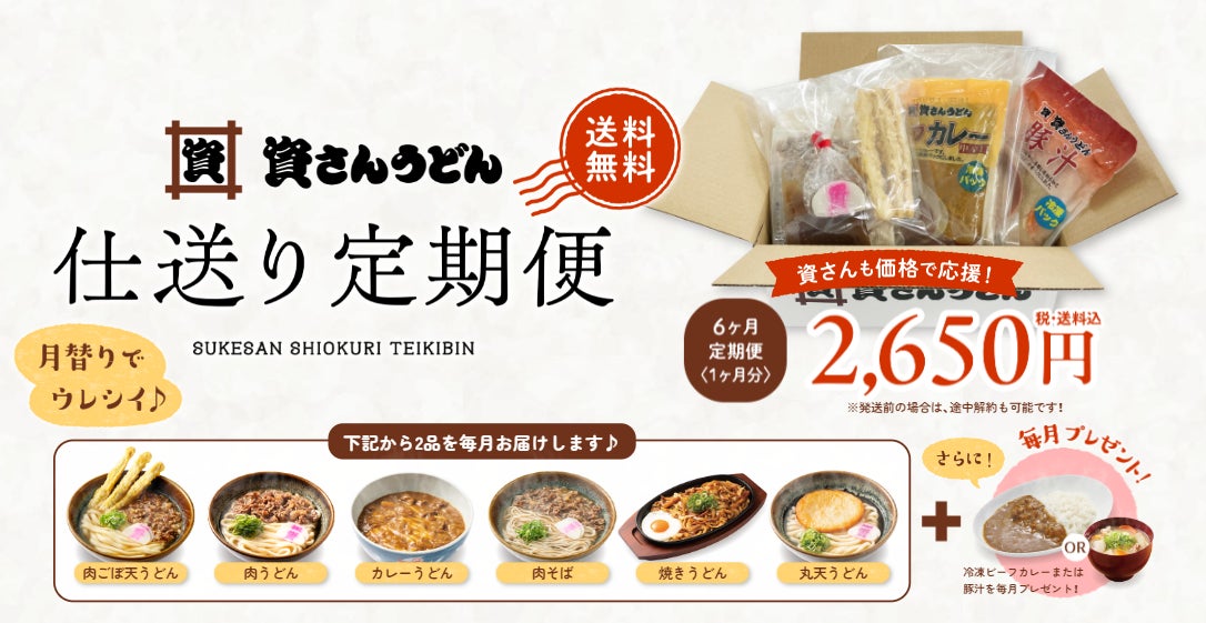 北九州のソウルフード「資さんうどん」は、自社通販サイト「資さんストア」にて、「仕送り定期便」のご提供を開始致しました!