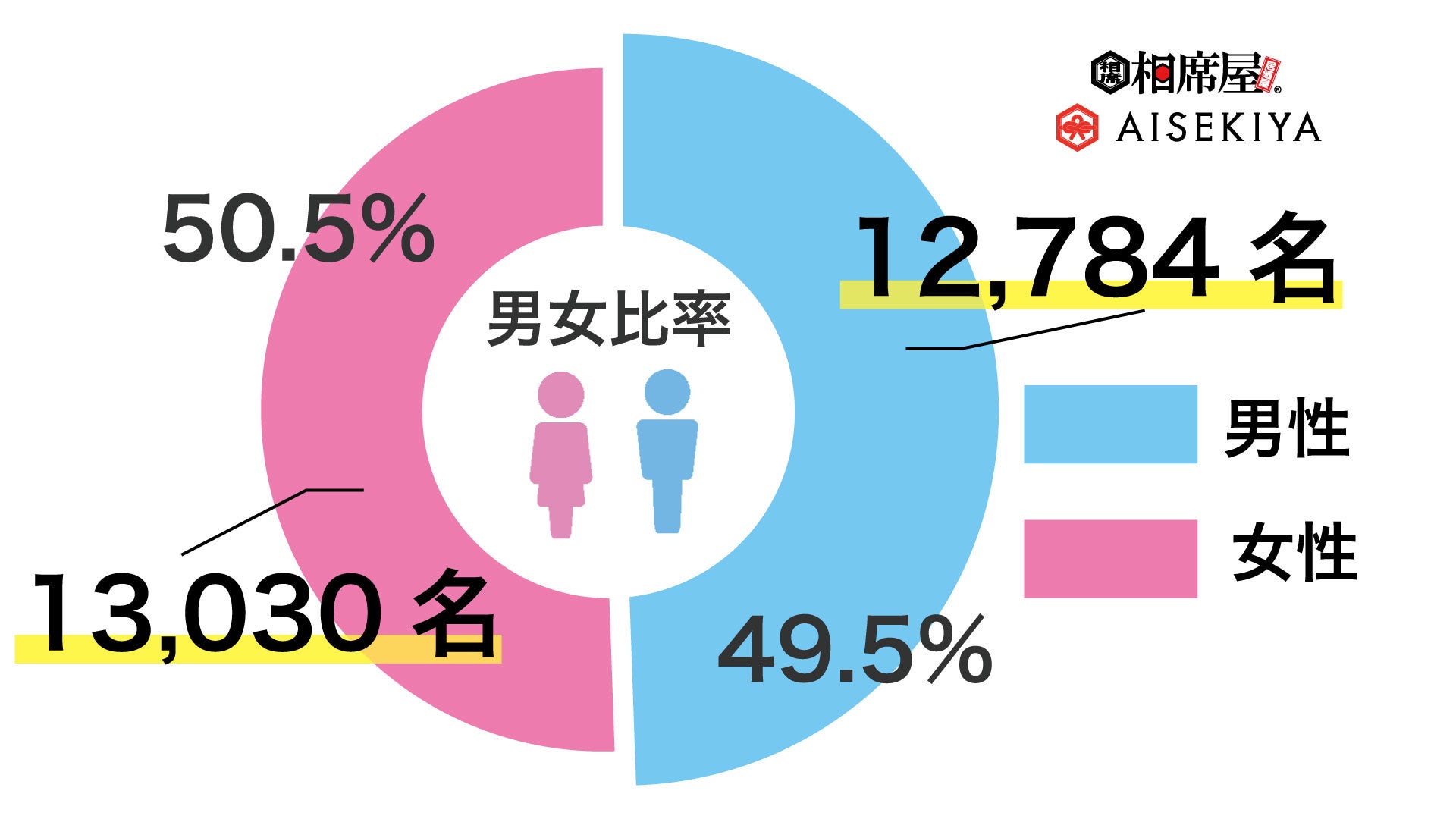 2024年5月の相席屋への男性来店数は12,784人、女性来店数は13,030人を突破。男性49.5%、女性50.5%でした。また、男性来店数のうち初めて来店した男性は4,071人、2回以上来店した男性は8,713人、⼥性来店数のうち初めて来店した⼥性は3,975⼈、2回以上来店した⼥性は9,055⼈でした。