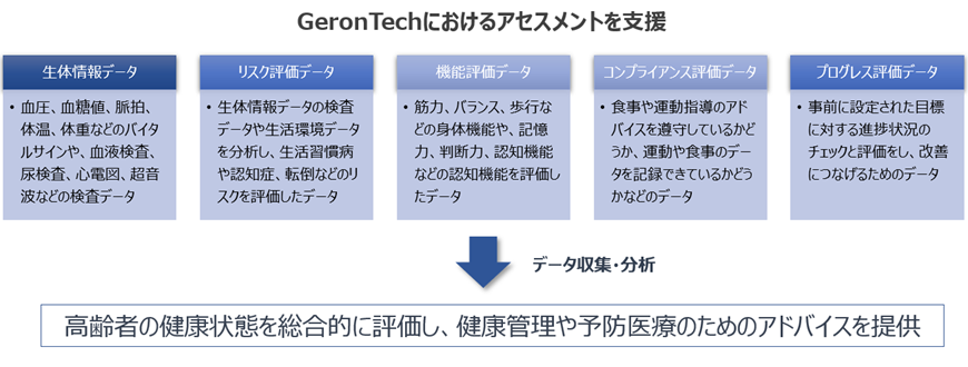 アセスメントを実施するためにGeronTechから生成されるデータは、多種多様な分野のツールやシステムから生成され、これらのデータを有効にデータ収集、分析することが必要です。これにより、高齢者の健康管理や介護サービス、生活支援などのサポートを行うことができるようになります。