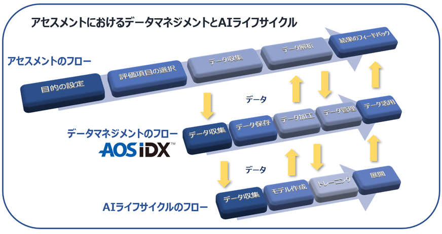 ヘルシーエイジングの実現に向け、アセスメントの実施におけるデータのフローと、データマネジメントおよびAIライフサイクルにおけるデータフローは、密接に関連した表裏一体の仕組みとなっており、アセスメントデータプラットフォームAOS IDXによりAI活用を踏まえたデータ管理を行うことができます。