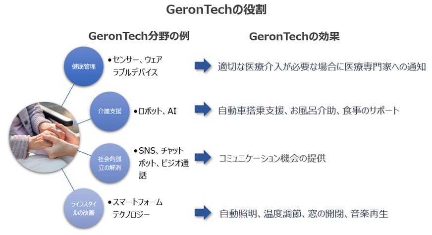また、GeronTechが適用される分野には、健康管理、金融、介護、福祉、保険、家電・ヘルスケア機器、車・交通システム、教育など、様々な分野が含まれています。
