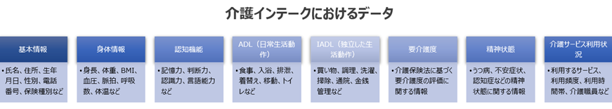 高齢者など介護が必要な方に対して介護サービスを提供するにあたり、介護保険制度を利用するための申請手続きの一つである介護インテークの支援においても多くのアセスメントデータが発生をします。介護インテークでは、本人や家族の情報、介護に必要な身体的な情報、認知機能、生活環境に関するデータなどが存在します。これらの情報をもとに、介護保険制度における要介護認定を行います。介護保険制度では、要介護認定の結果に応じて、介護度(要介護度または要支援度)が判断され、介護サービスの種類や負担割合が決定されます。