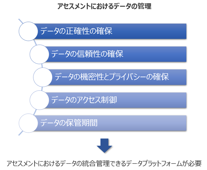 アセスメントの目的は、正確な情報を得ることです。そのためには、正確なデータと管理が必須です