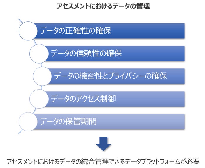 また、アセスメントにおけるデータの保管のステップでは、データ漏洩やセキュリティリスクから保護するために、データの正確性、信頼性、機密性、プライバシーの確保が求められ、これらのプロセスを統合的に管理できるデータプラットフォームの利用が求められます。